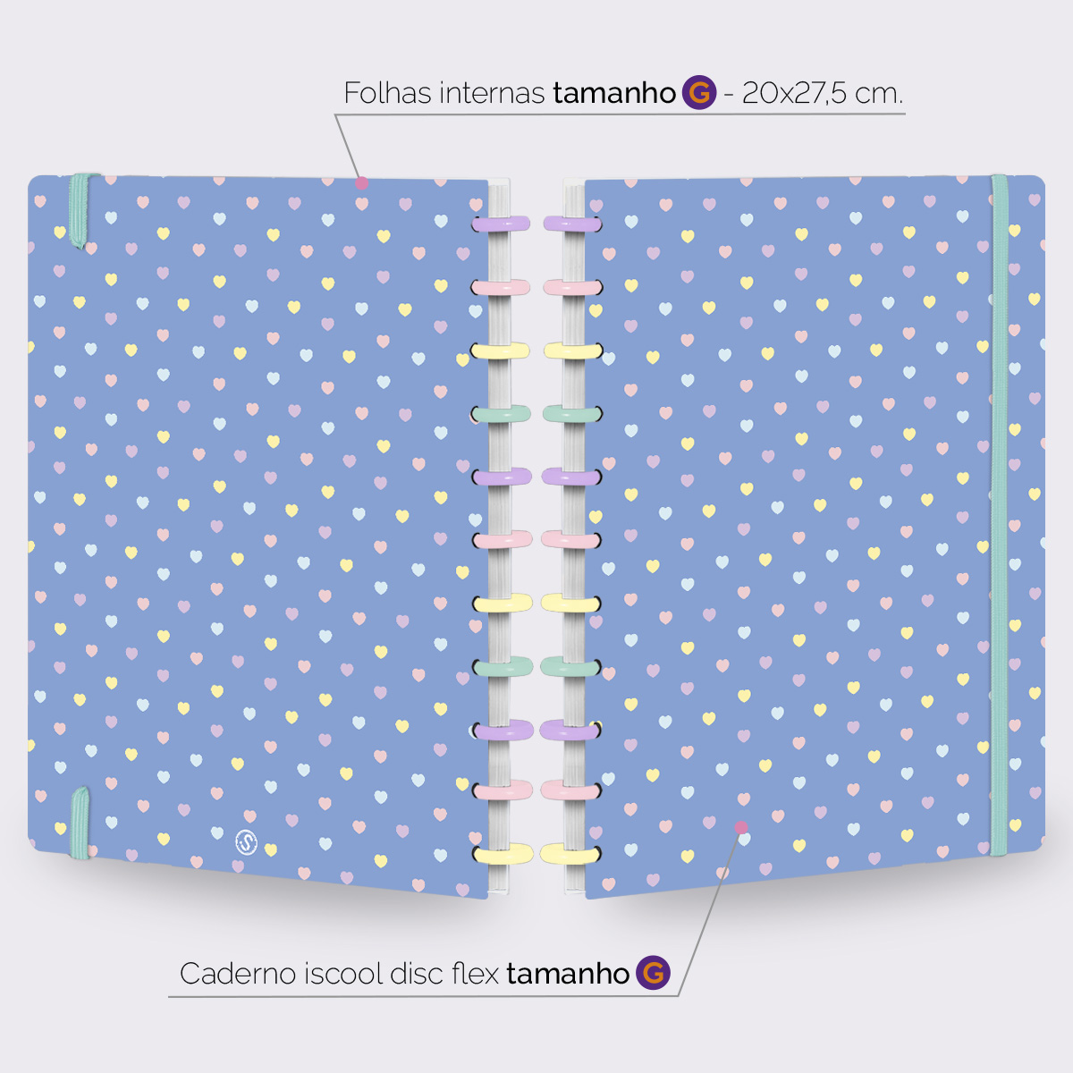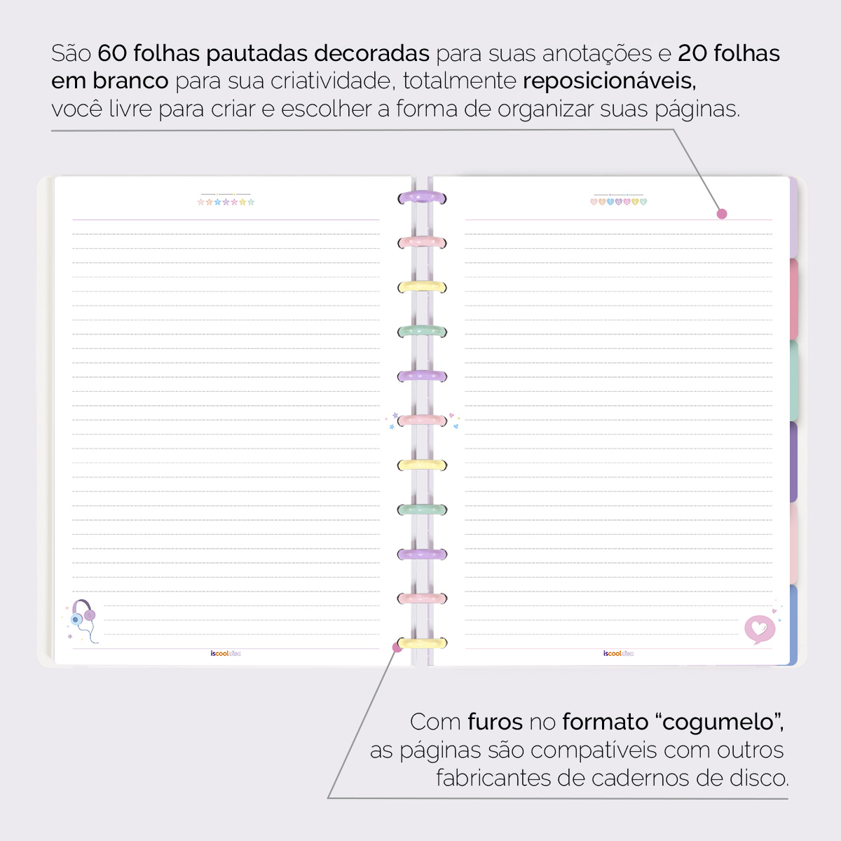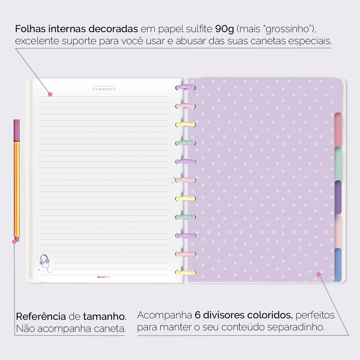 Além de tudo isso, o ISCOOL DISC FLEX, conta com detalhezinhos que fazem toda diferença: elástico removível para fechamento da capa, muito mais estilo e privacidade para suas anotações; bolsa plástica para guardar seus rascunhos, referências, lembretes, documentos e uma cartela de adesivos incríveis, para que você possa personalizar seu caderno do seu jeitinho!