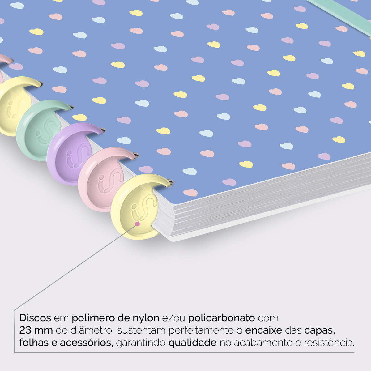Encadernado com 11 discos M de 23mm em polímero de nylon e/ou policarbonato coloridos, fabricados no Brasil.