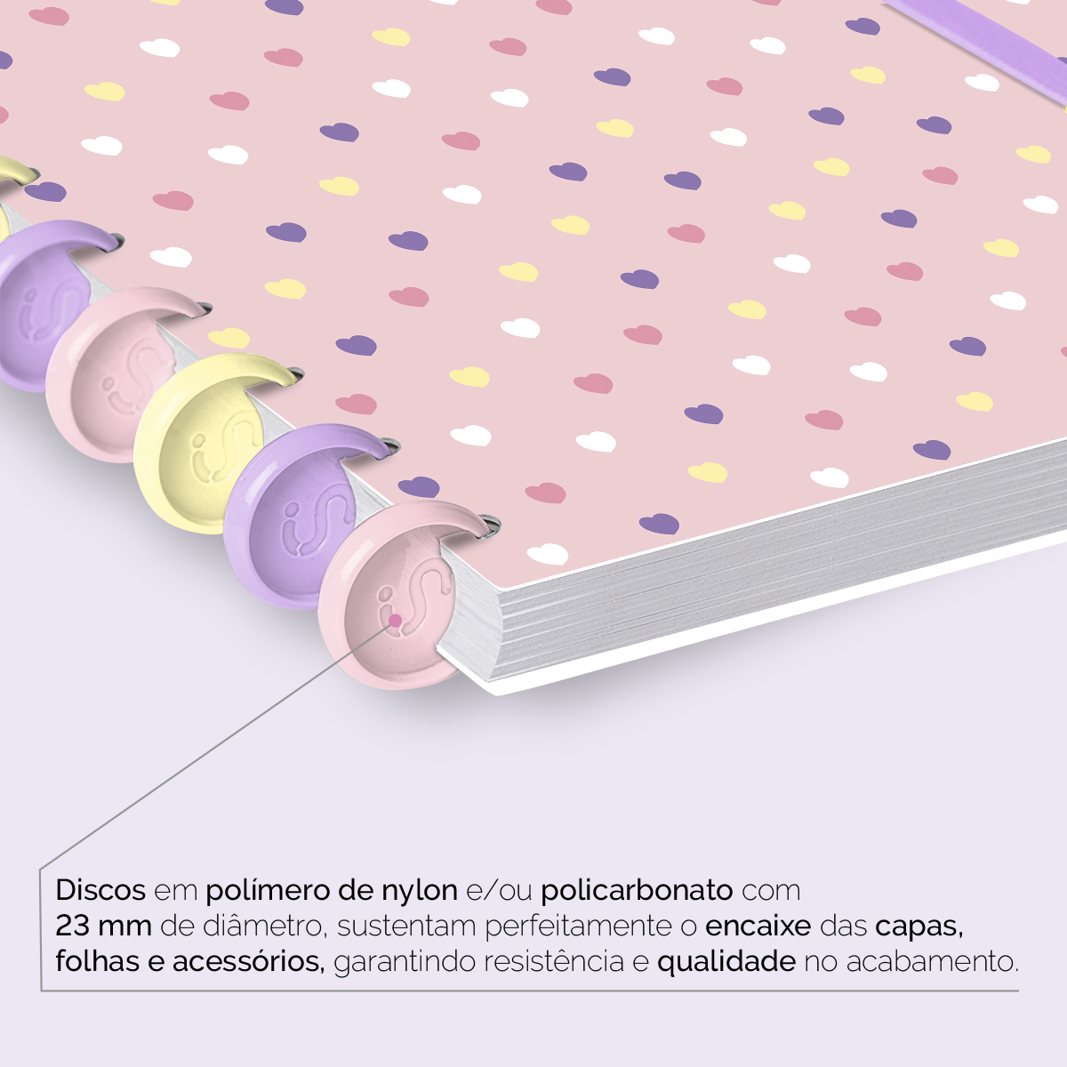 Encadernado com 11 discos M de 23mm em polímero de nylon e/ou policarbonato coloridos, fabricados no Brasil.