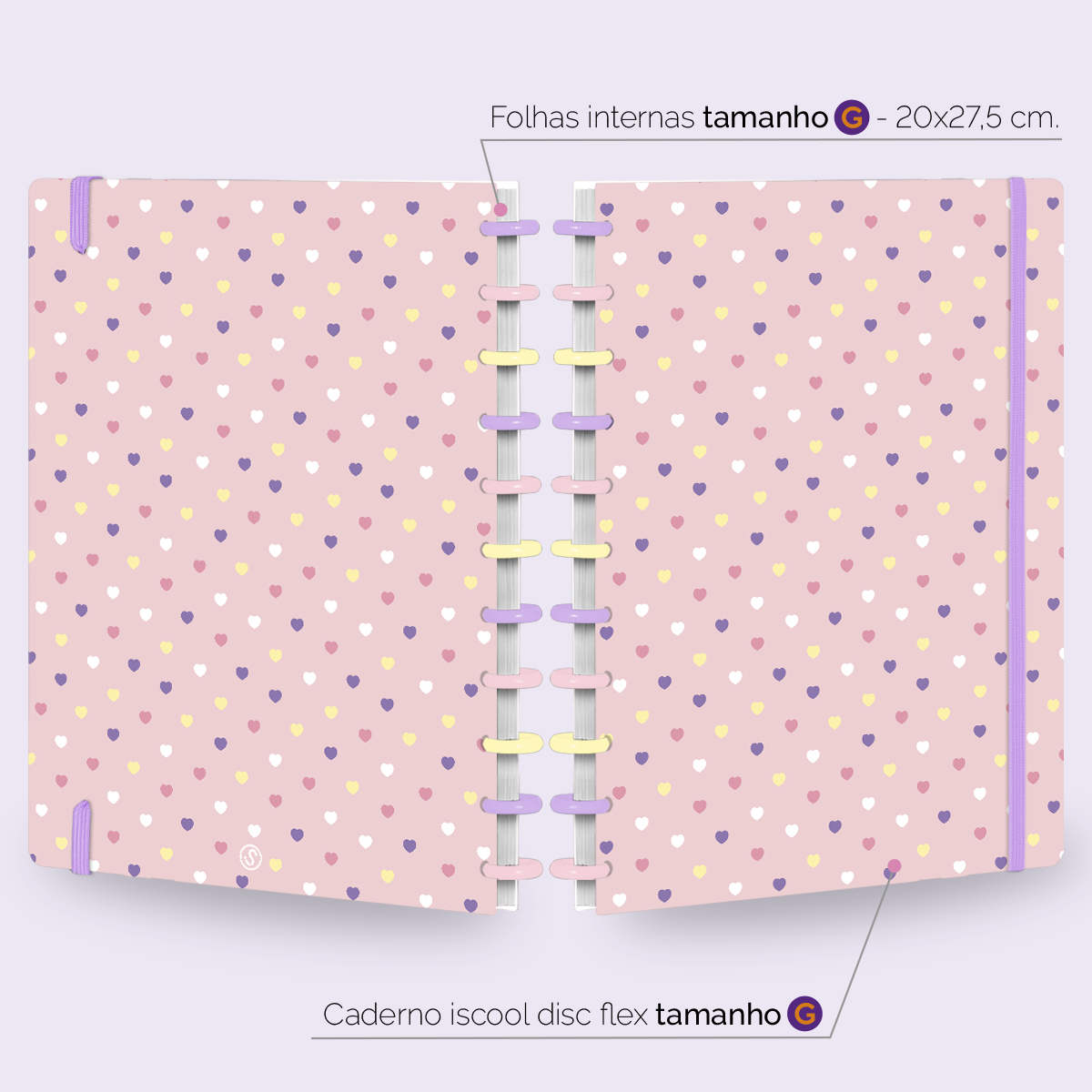 Além de tudo isso, o ISCOOL DISC FLEX, conta com detalhezinhos que fazem toda diferença: elástico removível para fechamento da capa, muito mais estilo e privacidade para suas anotações; bolsa plástica para guardar seus rascunhos, referências, lembretes, documentos e uma cartela de adesivos incríveis, para que você possa personalizar seu caderno do seu jeitinho!