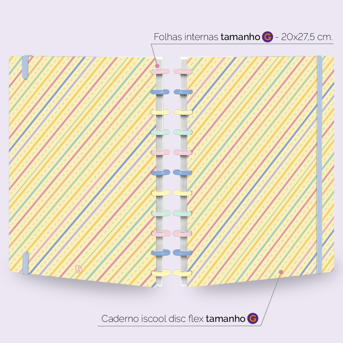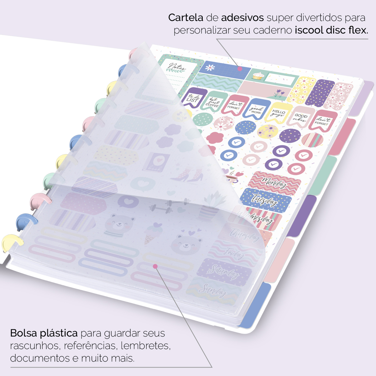 Além de tudo isso, o ISCOOL DISC FLEX, conta com detalhezinhos que fazem toda diferença: elástico removível para fechamento da capa, muito mais estilo e privacidade para suas anotações; bolsa plástica para guardar seus rascunhos, referências, lembretes, documentos e uma cartela de adesivos incríveis, para que você possa personalizar seu caderno do seu jeitinho!