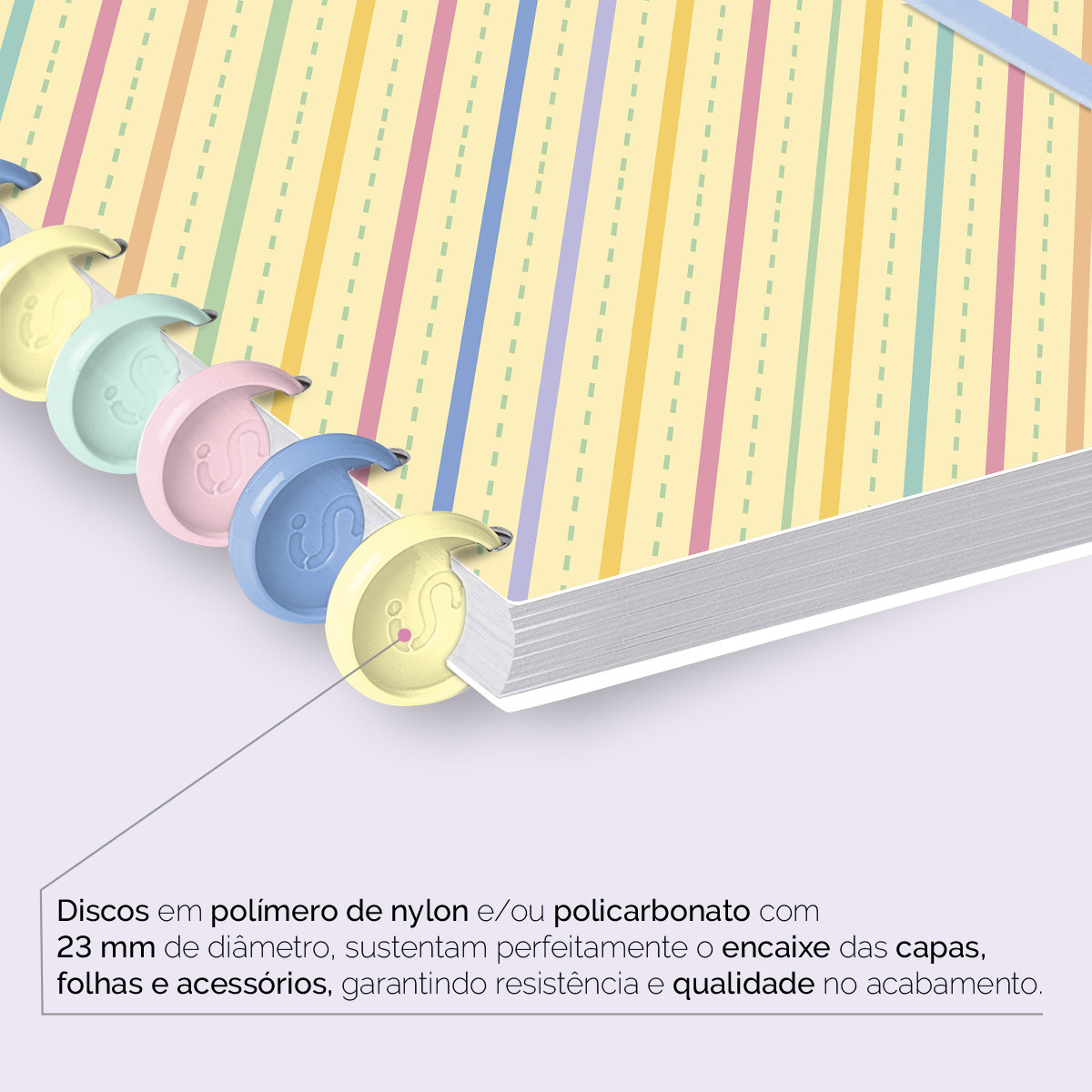 Encadernado com 11 discos M de 23mm em polímero de nylon e/ou policarbonato coloridos, fabricados no Brasil.