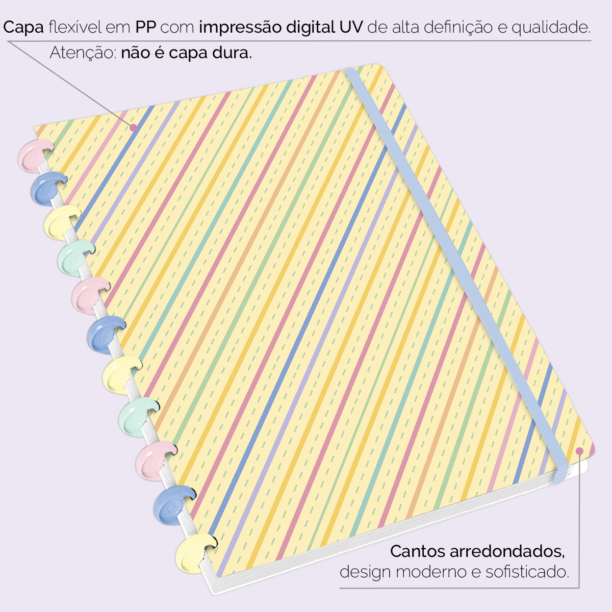 A capa é feita em PP com impressão digital UV de alta definição, acompanha 4 lindas divisórias, que você pode colocar em qualquer local do caderno, funcionando como o guia perfeito para sua organização.