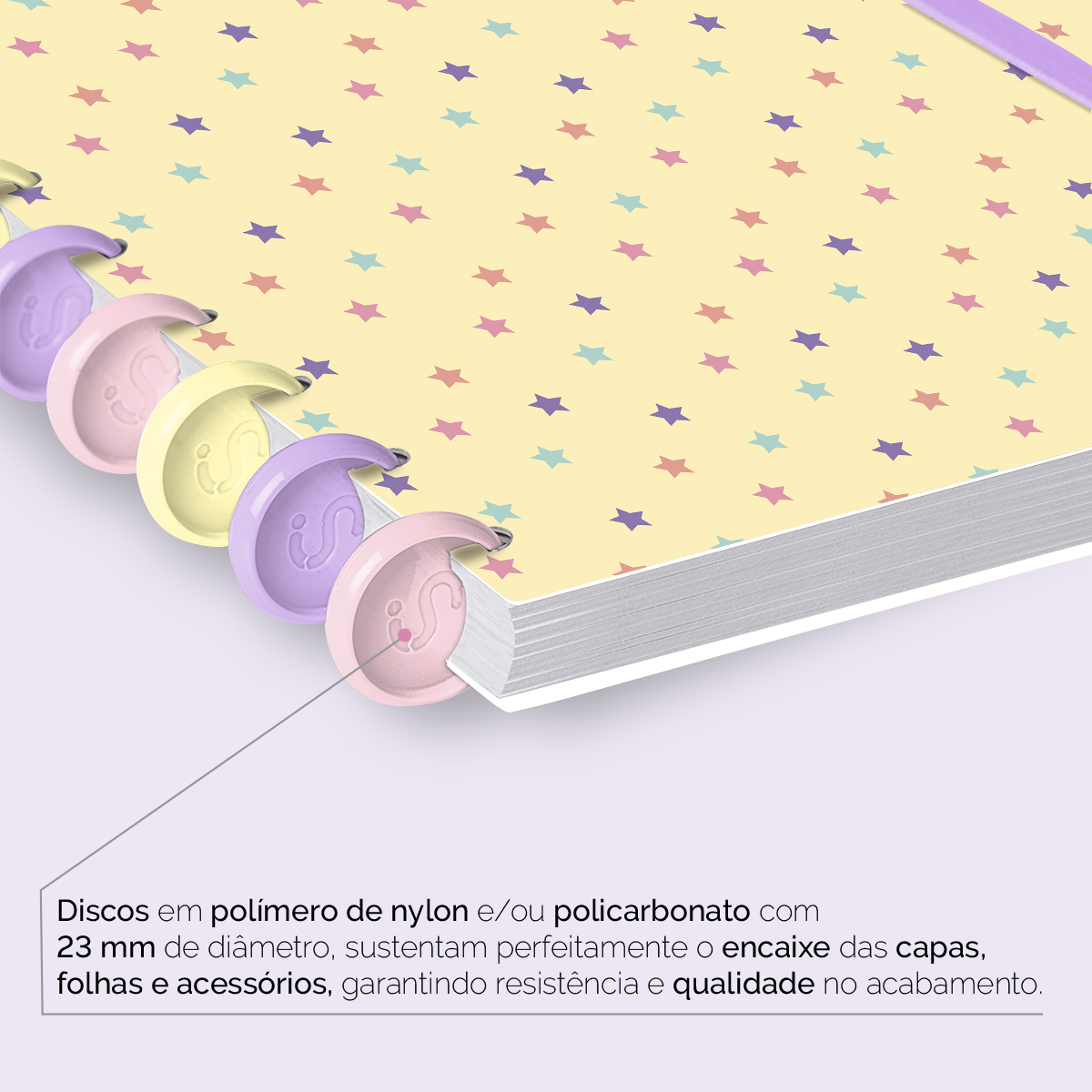 Encadernado com 11 discos M de 23mm em polímero de nylon e/ou policarbonato coloridos, fabricados no Brasil.