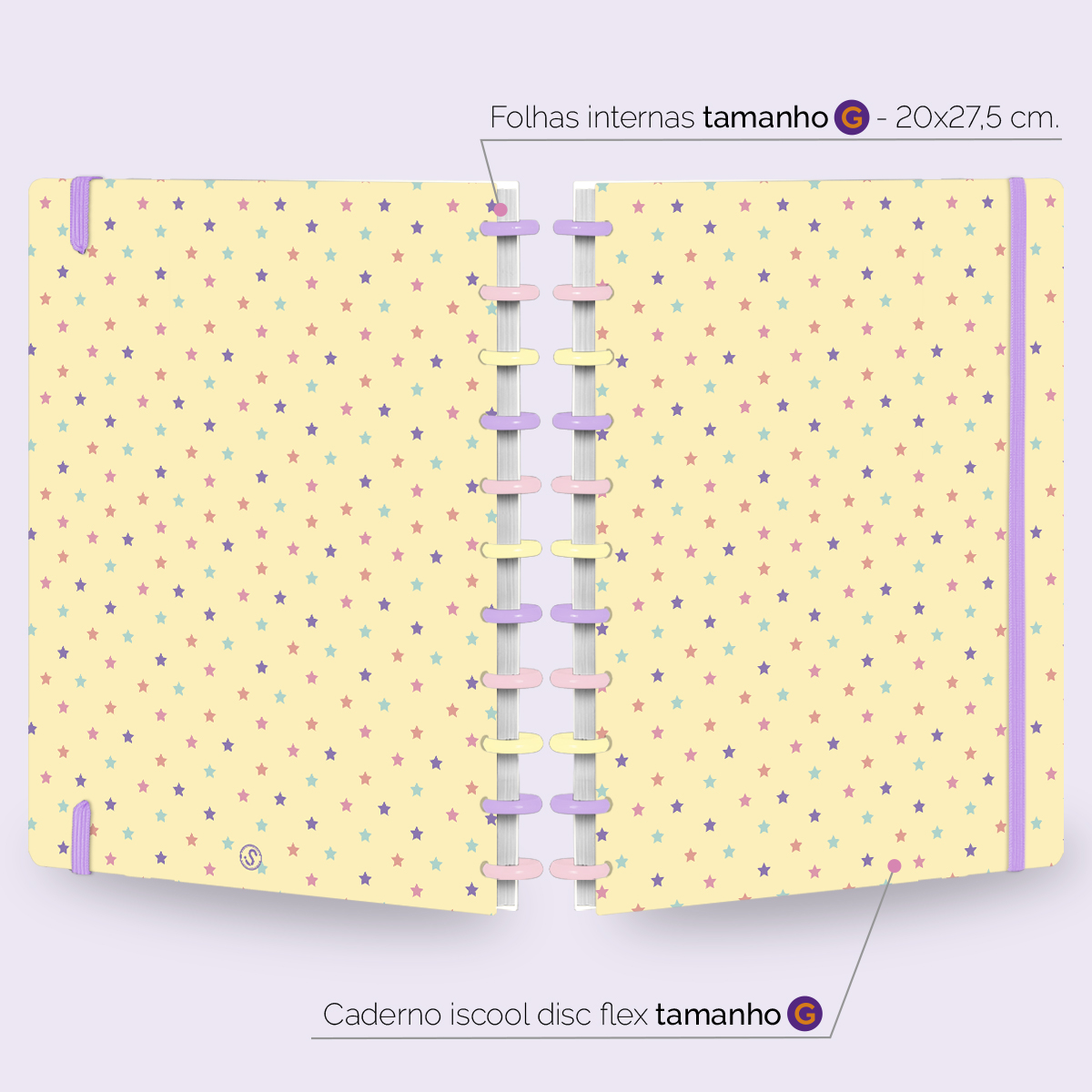 Além de tudo isso, o ISCOOL DISC FLEX, conta com detalhezinhos que fazem toda diferença: elástico removível para fechamento da capa, muito mais estilo e privacidade para suas anotações; bolsa plástica para guardar seus rascunhos, referências, lembretes, documentos e uma cartela de adesivos incríveis, para que você possa personalizar seu caderno do seu jeitinho!