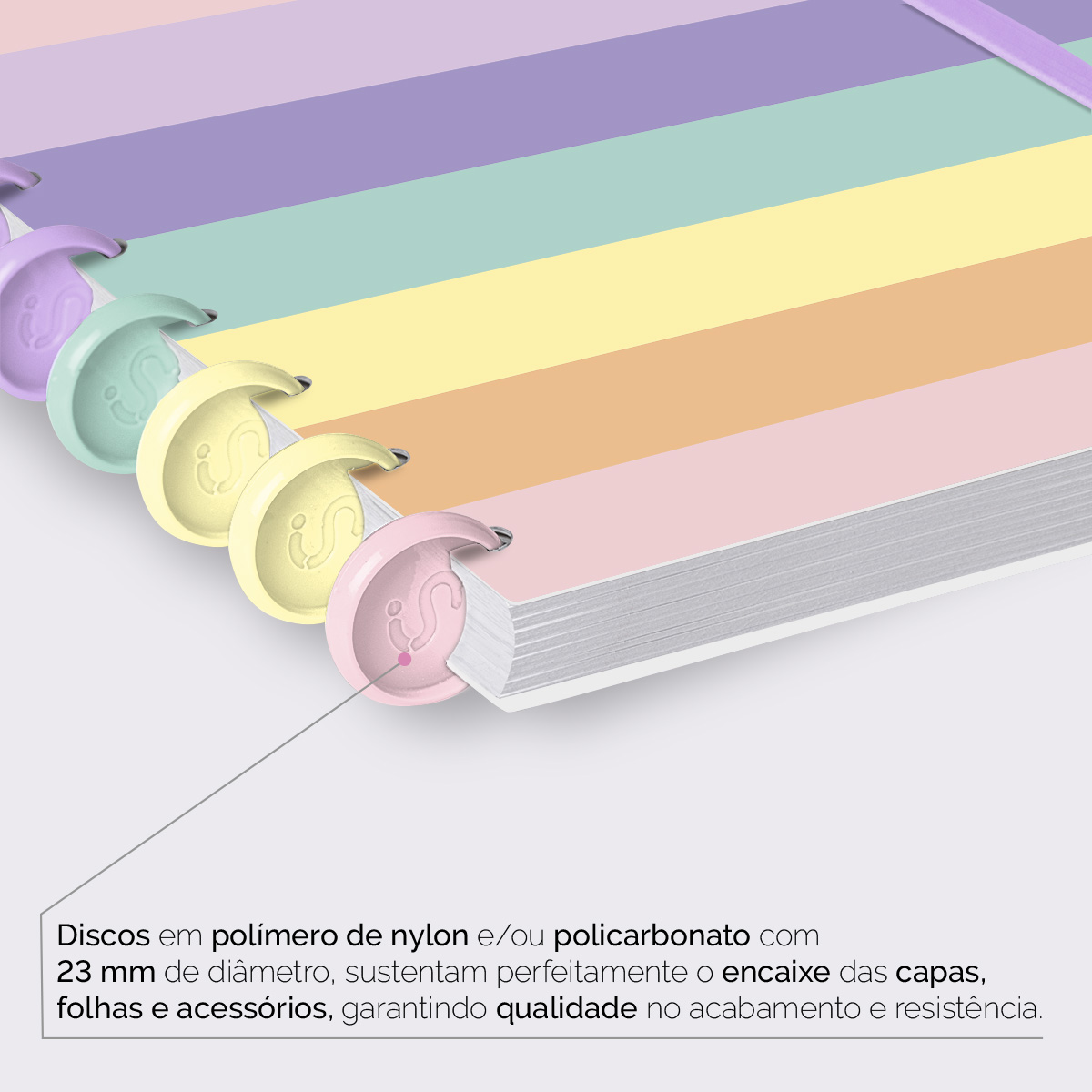 Encadernado com 11 discos M de 23mm em polímero de nylon e/ou policarbonato coloridos, fabricados no Brasil.