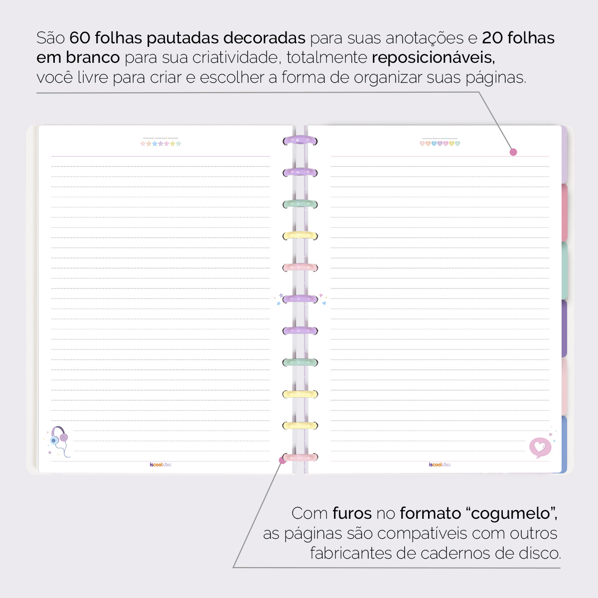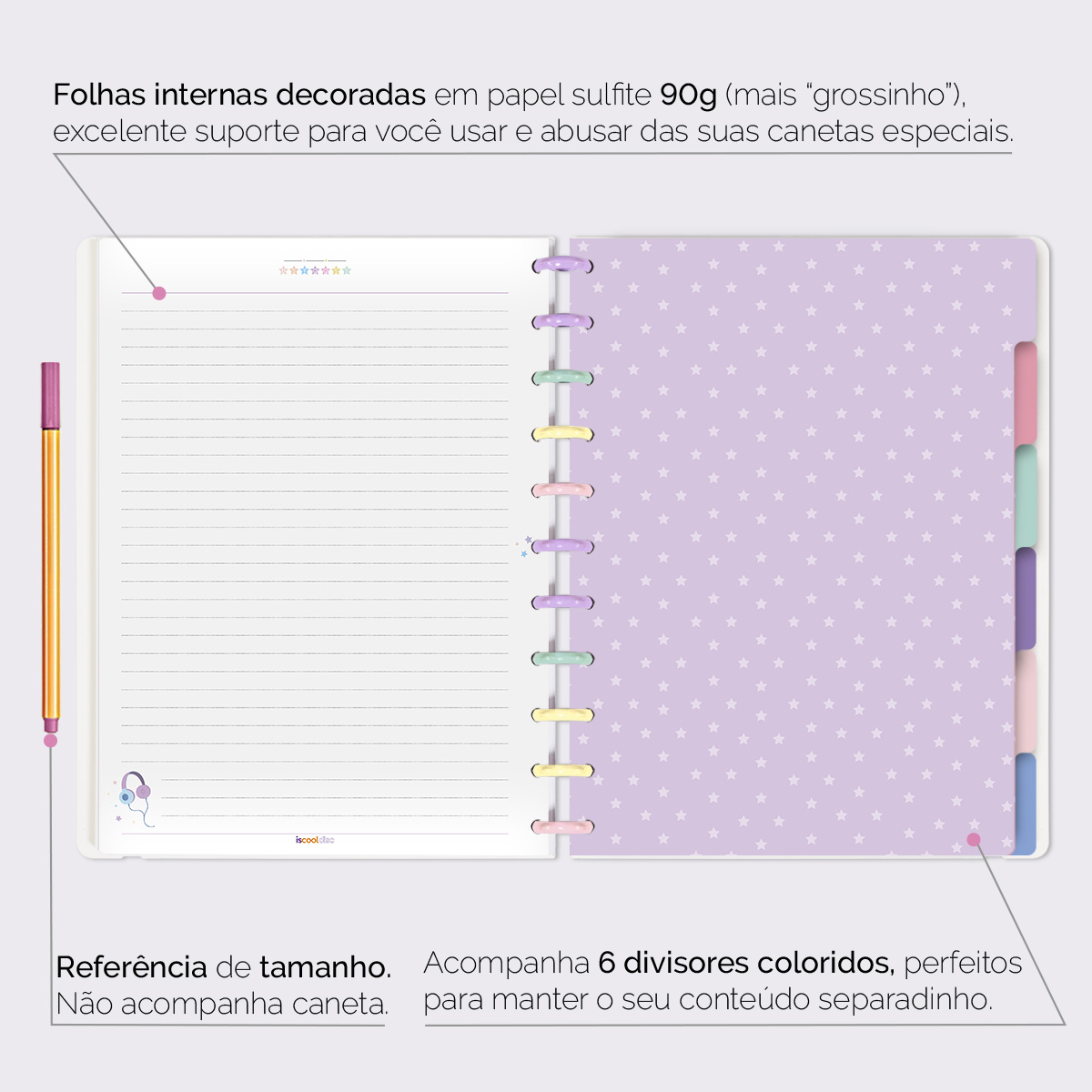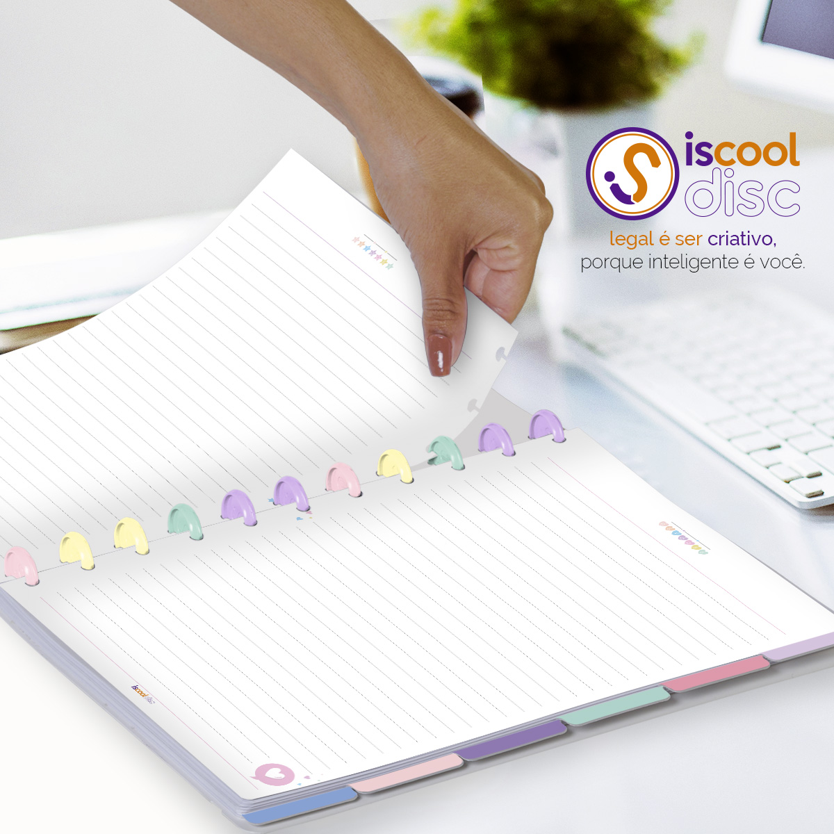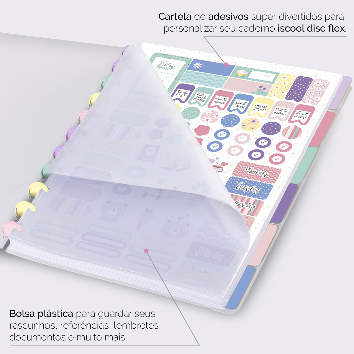 Além de tudo isso, o ISCOOL DISC FLEX, conta com detalhezinhos que fazem toda diferença: elástico removível para fechamento da capa, muito mais estilo e privacidade para suas anotações; bolsa plástica para guardar seus rascunhos, referências, lembretes, documentos e uma cartela de adesivos incríveis, para que você possa personalizar seu caderno do seu jeitinho!