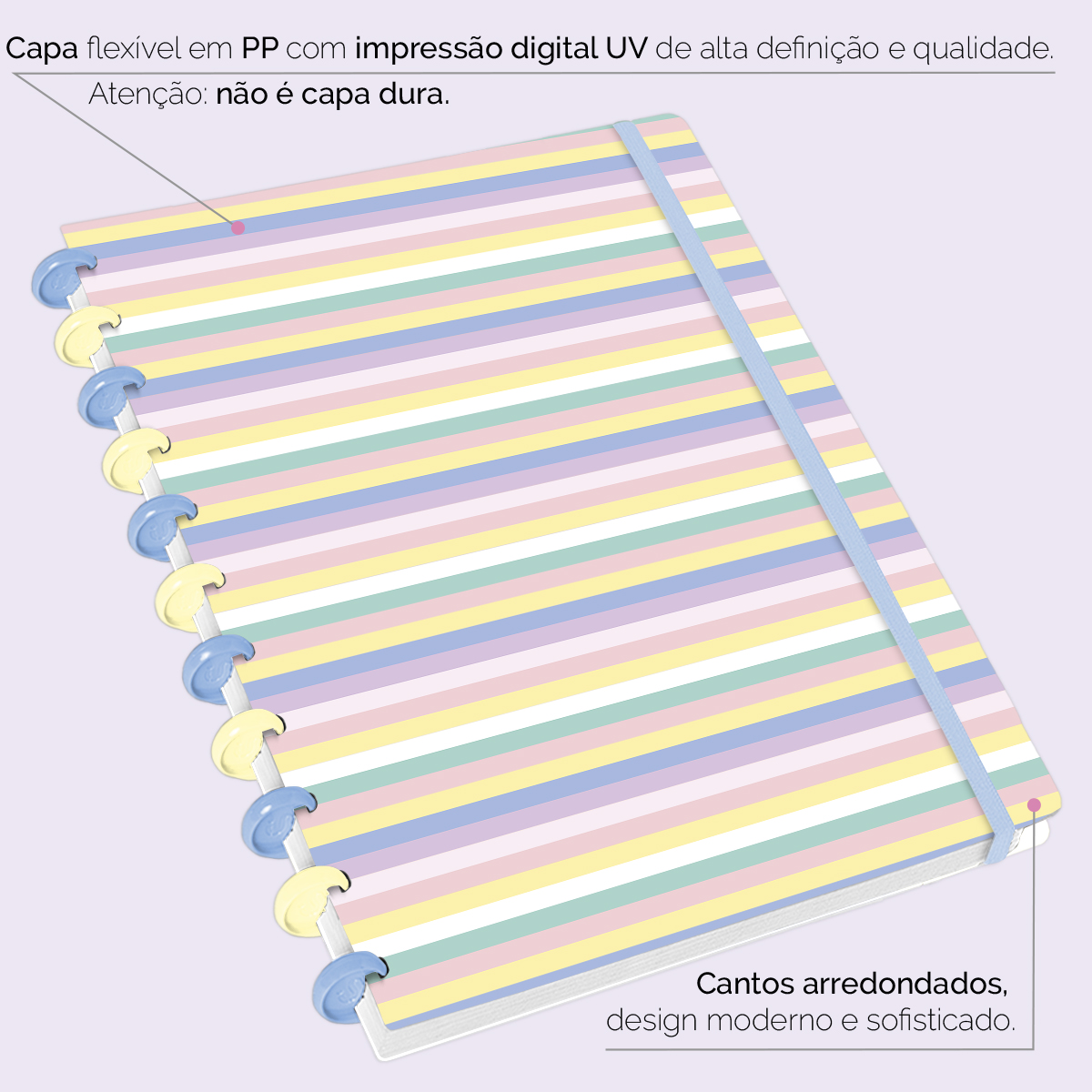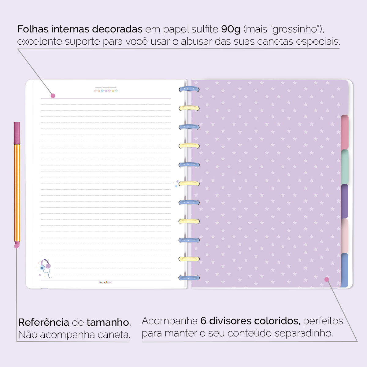 A capa é feita em PP com impressão digital UV de alta definição, acompanha 4 lindas divisórias, que você pode colocar em qualquer local do caderno, funcionando como o guia perfeito para sua organização.