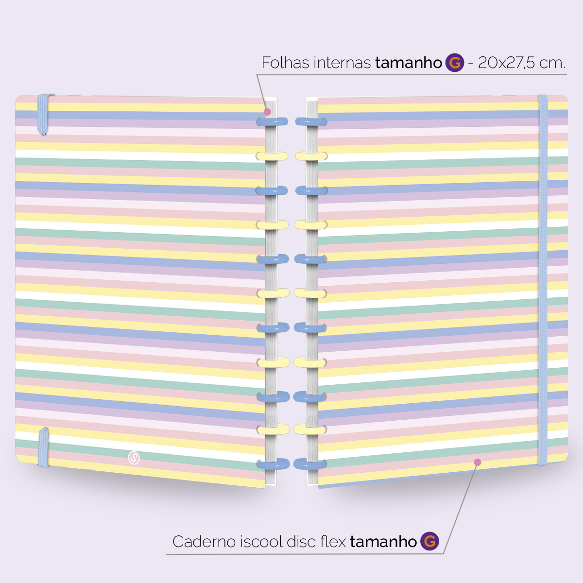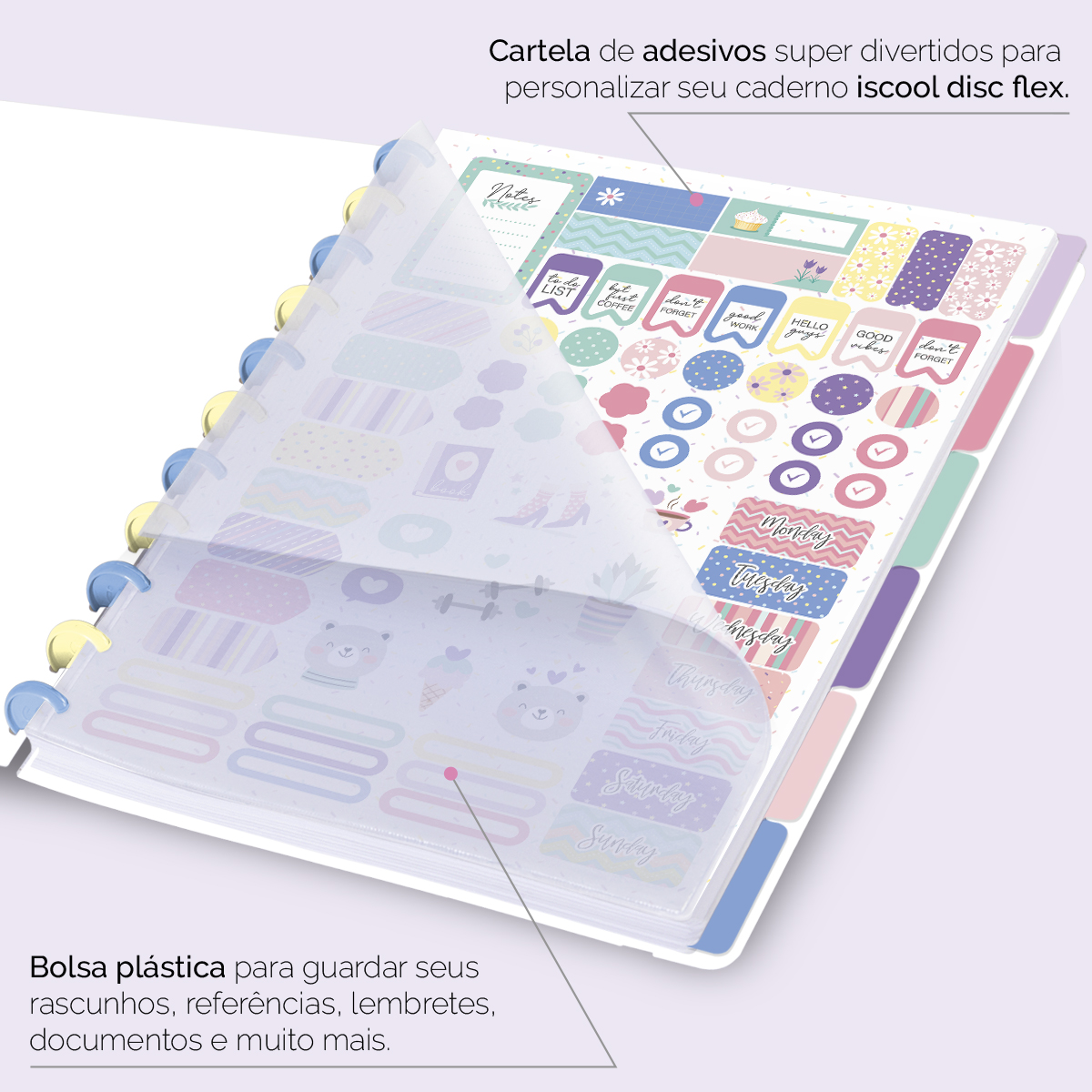 Além de tudo isso, o ISCOOL DISC FLEX, conta com detalhezinhos que fazem toda diferença: elástico removível para fechamento da capa, muito mais estilo e privacidade para suas anotações; bolsa plástica para guardar seus rascunhos, referências, lembretes, documentos e uma cartela de adesivos incríveis, para que você possa personalizar seu caderno do seu jeitinho!