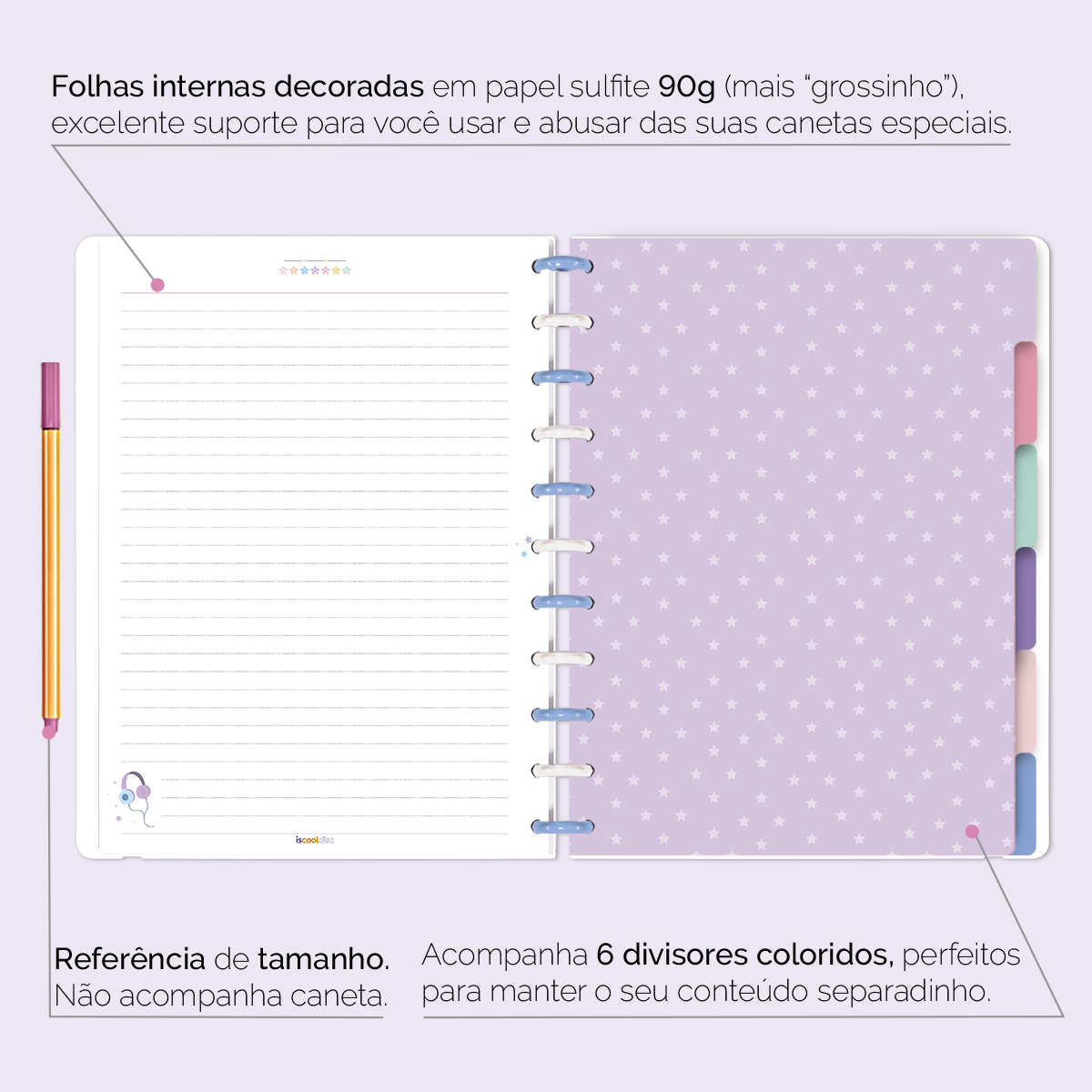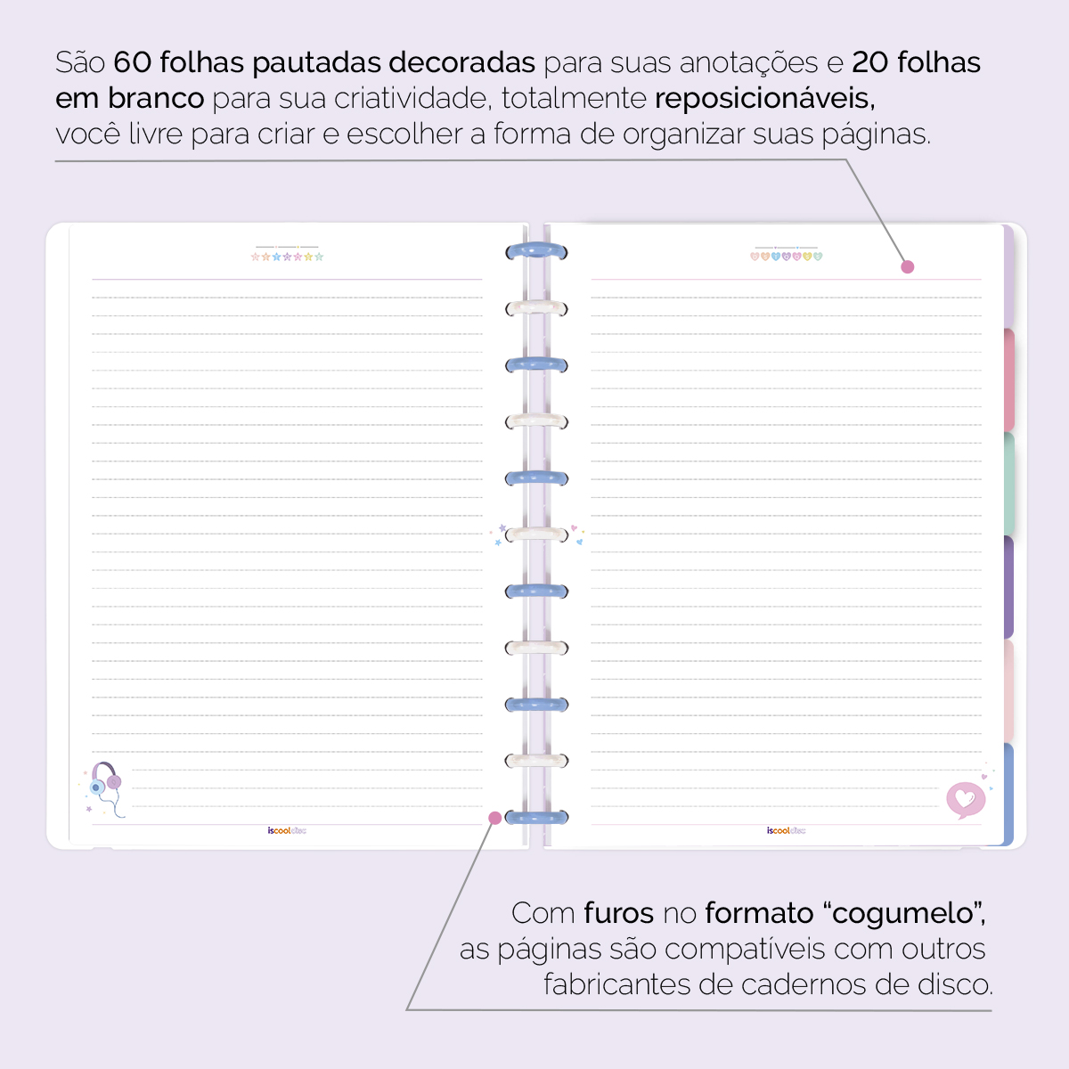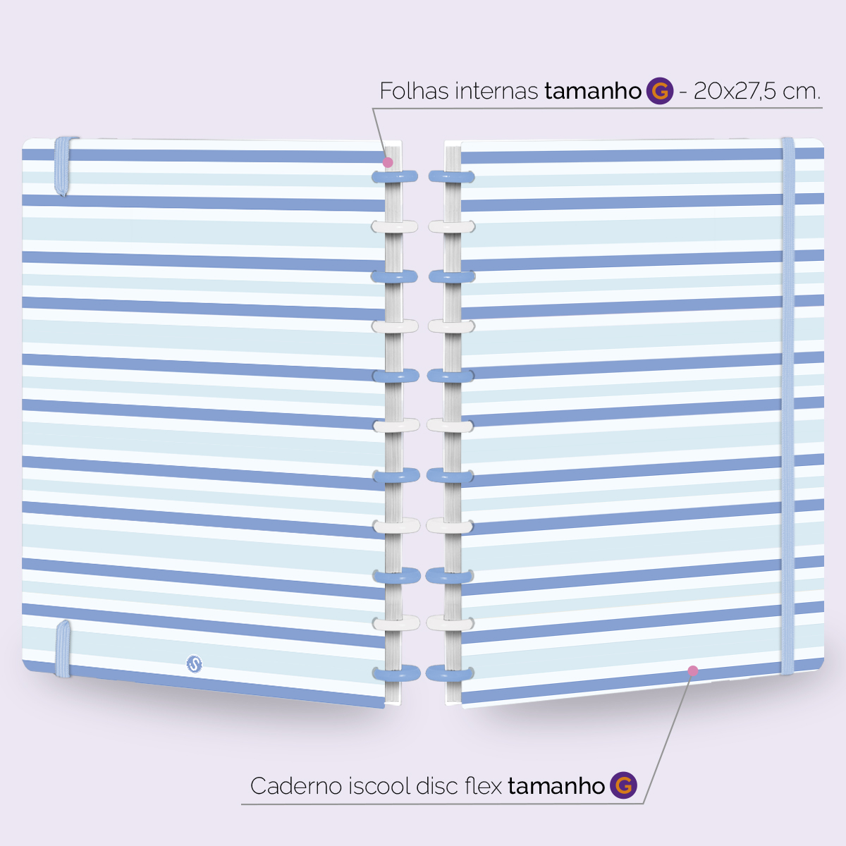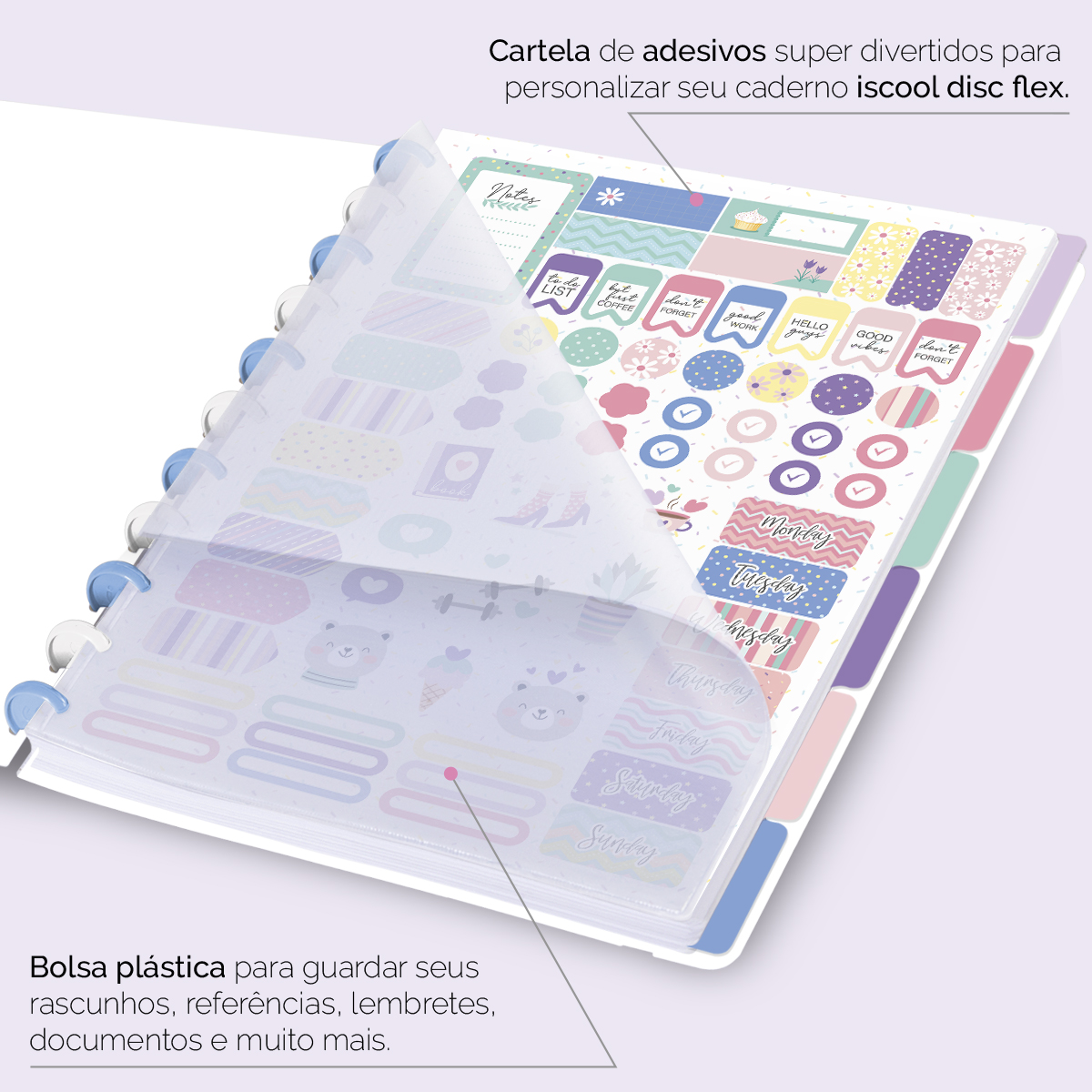 Além de tudo isso, o ISCOOL DISC FLEX, conta com detalhezinhos que fazem toda diferença: elástico removível para fechamento da capa, muito mais estilo e privacidade para suas anotações; bolsa plástica para guardar seus rascunhos, referências, lembretes, documentos e uma cartela de adesivos incríveis, para que você possa personalizar seu caderno do seu jeitinho!