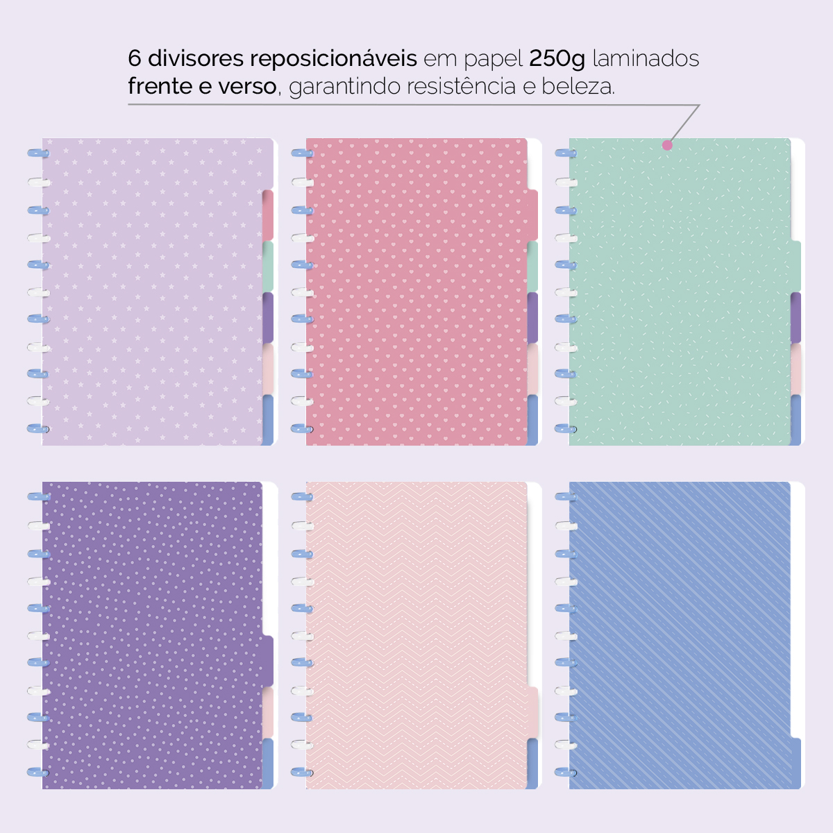A capa é feita em PP com impressão digital UV de alta definição, acompanha 4 lindas divisórias, que você pode colocar em qualquer local do caderno, funcionando como o guia perfeito para sua organização.