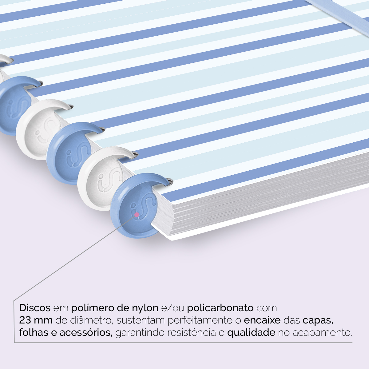 Encadernado com 11 discos M de 23mm em polímero de nylon e/ou policarbonato coloridos, fabricados no Brasil.