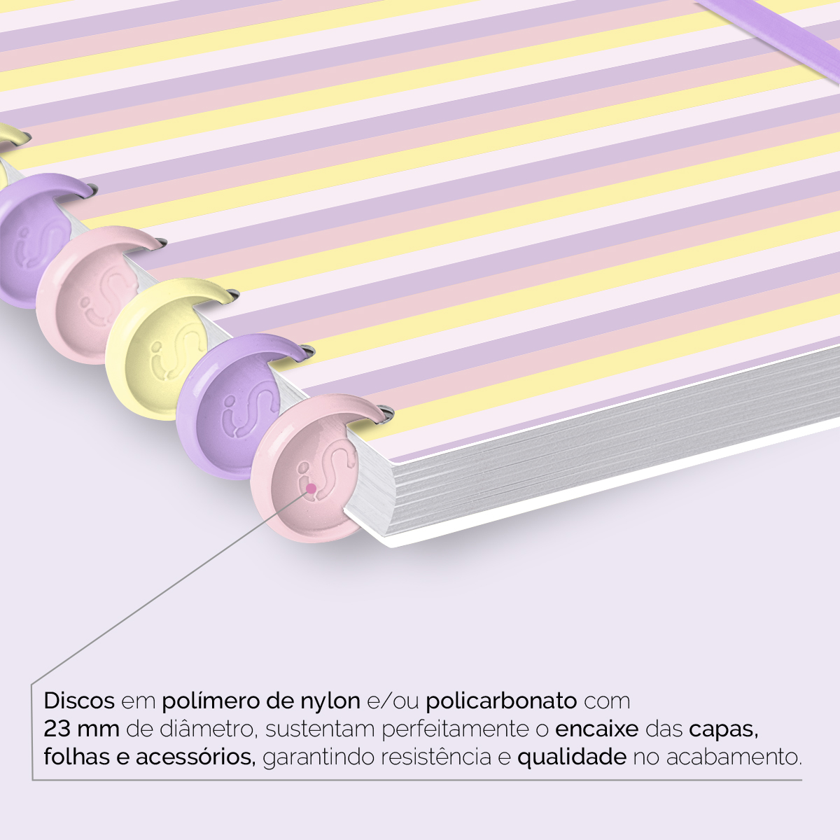 Encadernado com 11 discos M de 23mm em polímero de nylon e/ou policarbonato coloridos, fabricados no Brasil.