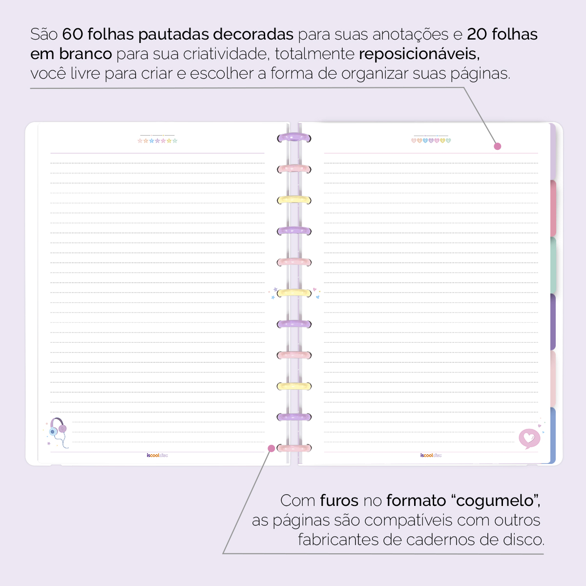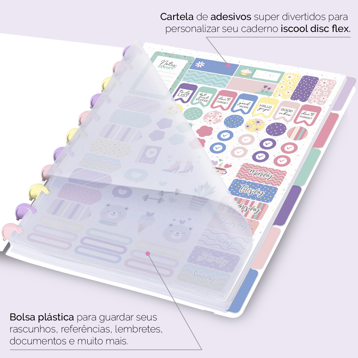 Além de tudo isso, o ISCOOL DISC FLEX, conta com detalhezinhos que fazem toda diferença: elástico removível para fechamento da capa, muito mais estilo e privacidade para suas anotações; bolsa plástica para guardar seus rascunhos, referências, lembretes, documentos e uma cartela de adesivos incríveis, para que você possa personalizar seu caderno do seu jeitinho!