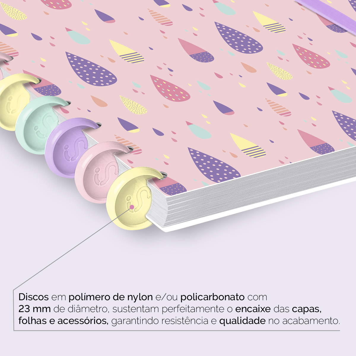 Encadernado com 11 discos M de 23mm em polímero de nylon e/ou policarbonato coloridos, fabricados no Brasil.