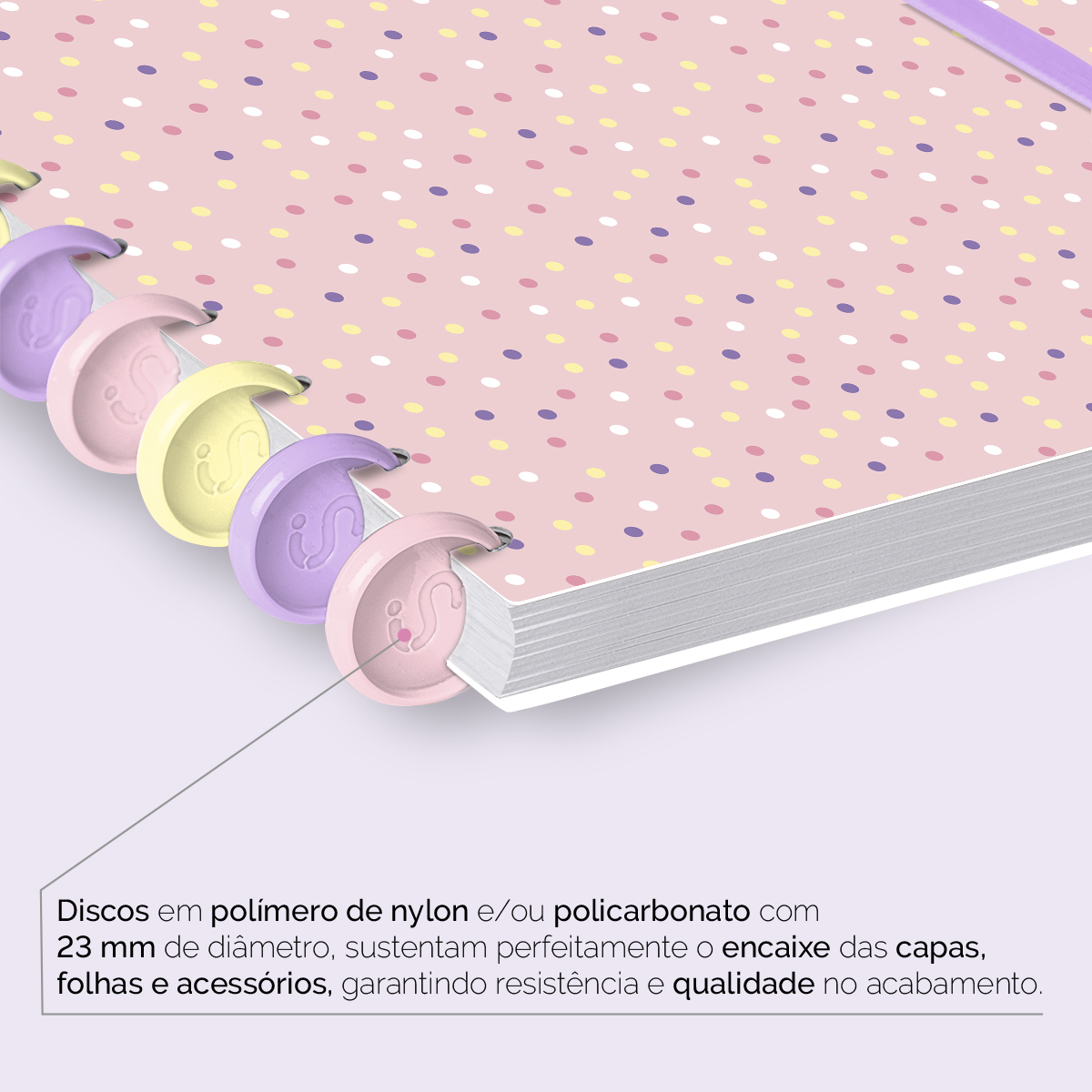 Encadernado com 11 discos M de 23mm em polímero de nylon e/ou policarbonato coloridos, fabricados no Brasil.