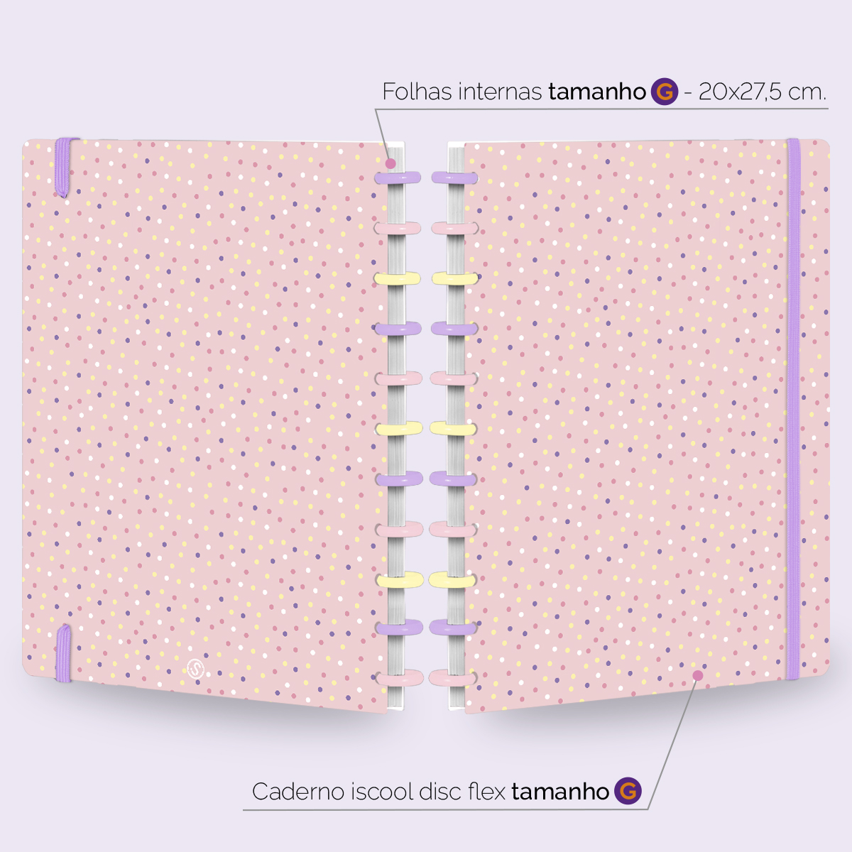 Além de tudo isso, o ISCOOL DISC FLEX, conta com detalhezinhos que fazem toda diferença: elástico removível para fechamento da capa, muito mais estilo e privacidade para suas anotações; bolsa plástica para guardar seus rascunhos, referências, lembretes, documentos e uma cartela de adesivos incríveis, para que você possa personalizar seu caderno do seu jeitinho!