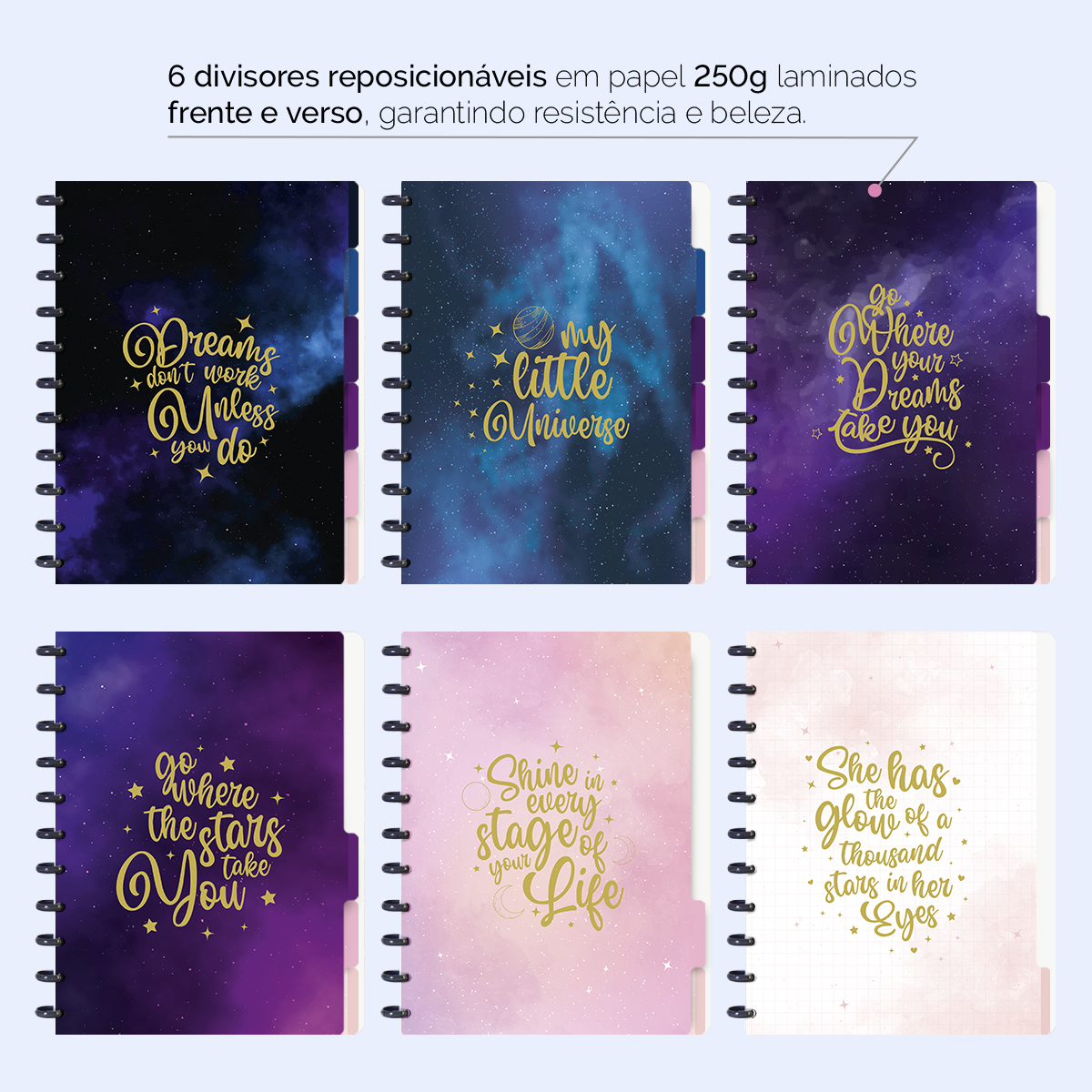 A capa é feita em PP com impressão digital UV de alta definição, acompanha 4 lindas divisórias, que você pode colocar em qualquer local do caderno, funcionando como o guia perfeito para sua organização.