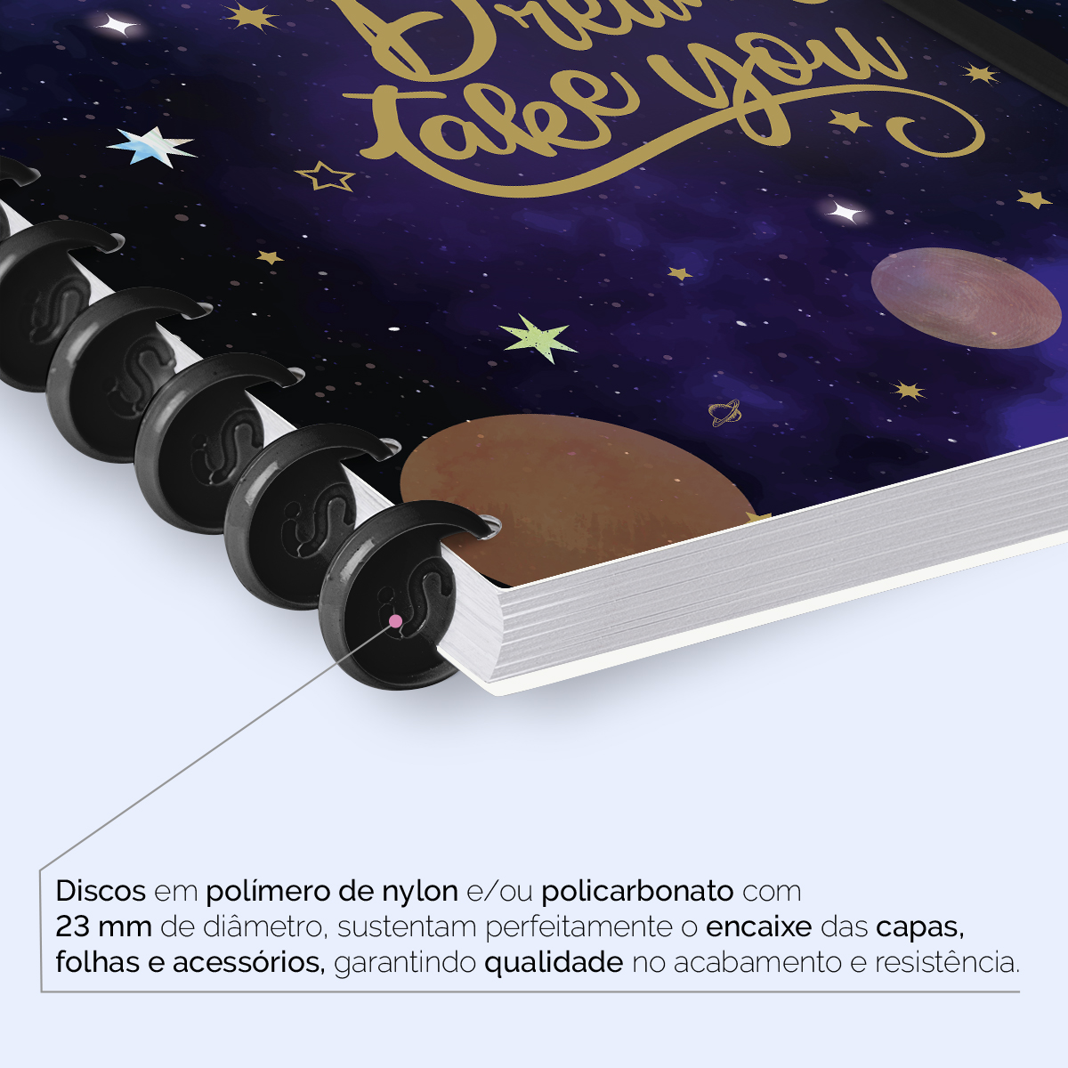 Encadernado com 11 discos M de 23mm em polímero de nylon e/ou policarbonato coloridos, fabricados no Brasil.