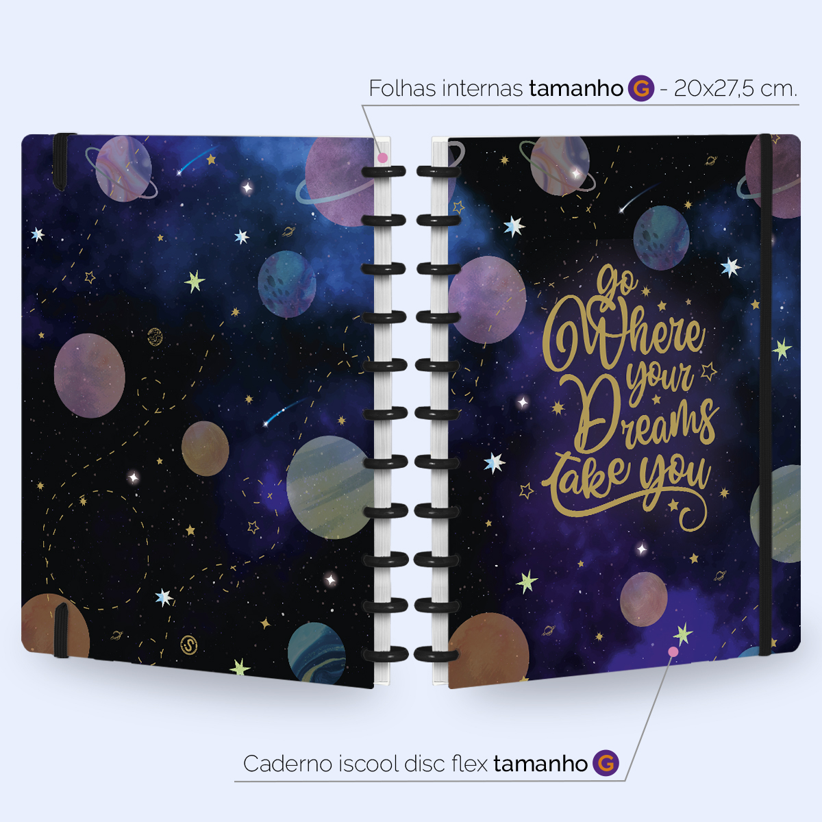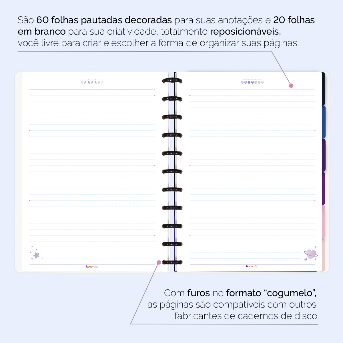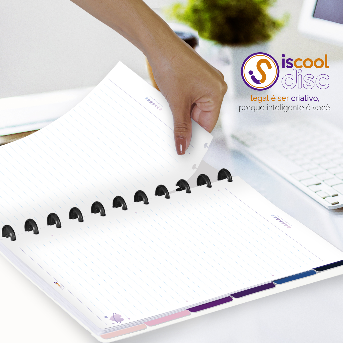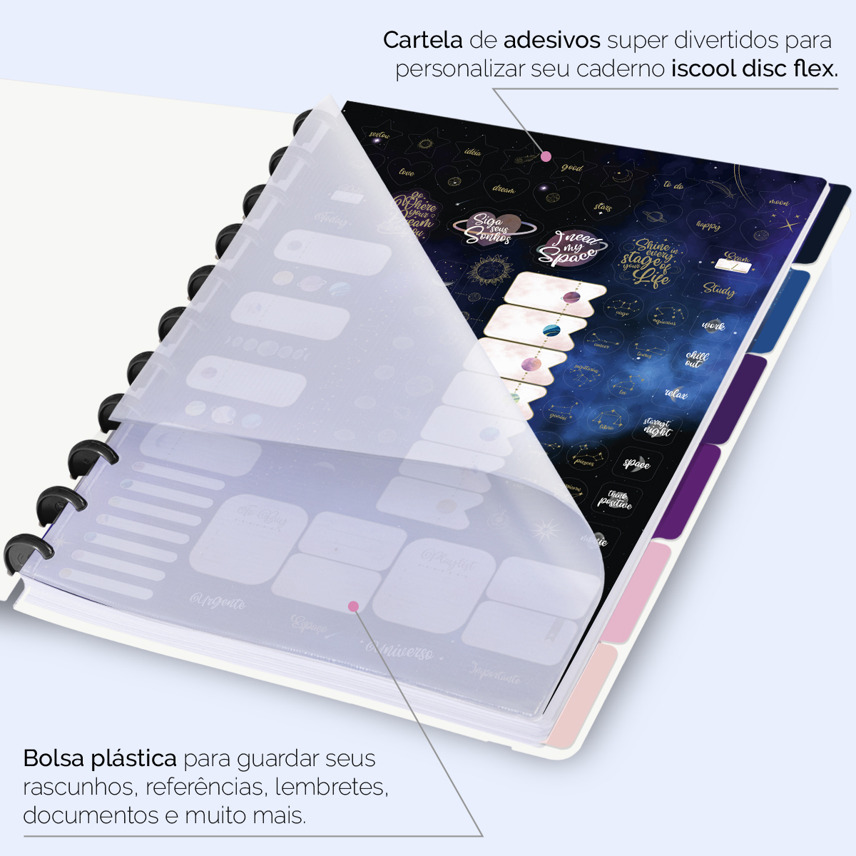Além de tudo isso, o ISCOOL DISC FLEX, conta com detalhezinhos que fazem toda diferença: elástico removível para fechamento da capa, muito mais estilo e privacidade para suas anotações; bolsa plástica para guardar seus rascunhos, referências, lembretes, documentos e uma cartela de adesivos incríveis, para que você possa personalizar seu caderno do seu jeitinho!