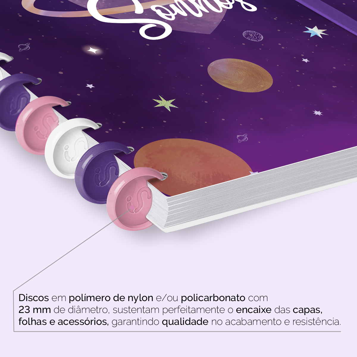 Encadernado com 11 discos M de 23mm em polímero de nylon e/ou policarbonato coloridos, fabricados no Brasil.