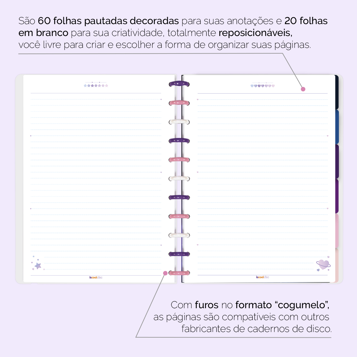 Além de tudo isso, o ISCOOL DISC FLEX, conta com detalhezinhos que fazem toda diferença: elástico removível para fechamento da capa, muito mais estilo e privacidade para suas anotações; bolsa plástica para guardar seus rascunhos, referências, lembretes, documentos e uma cartela de adesivos incríveis, para que você possa personalizar seu caderno do seu jeitinho!