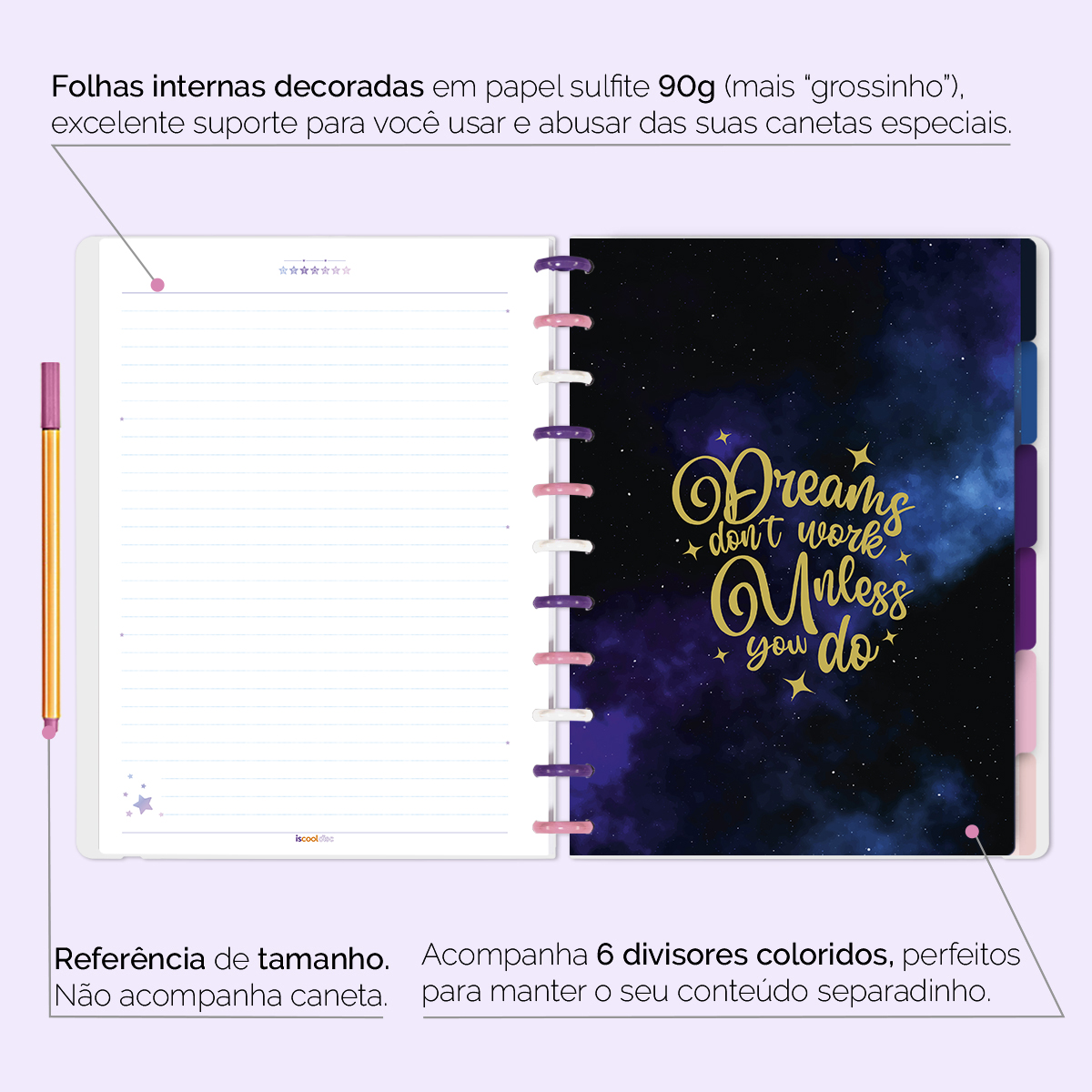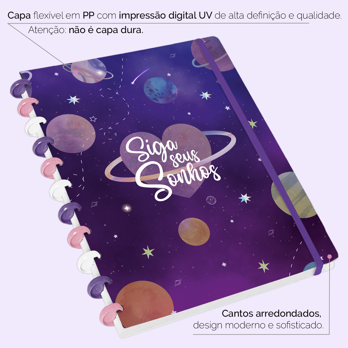 A capa é feita em PP com impressão digital UV de alta definição, acompanha 4 lindas divisórias, que você pode colocar em qualquer local do caderno, funcionando como o guia perfeito para sua organização.