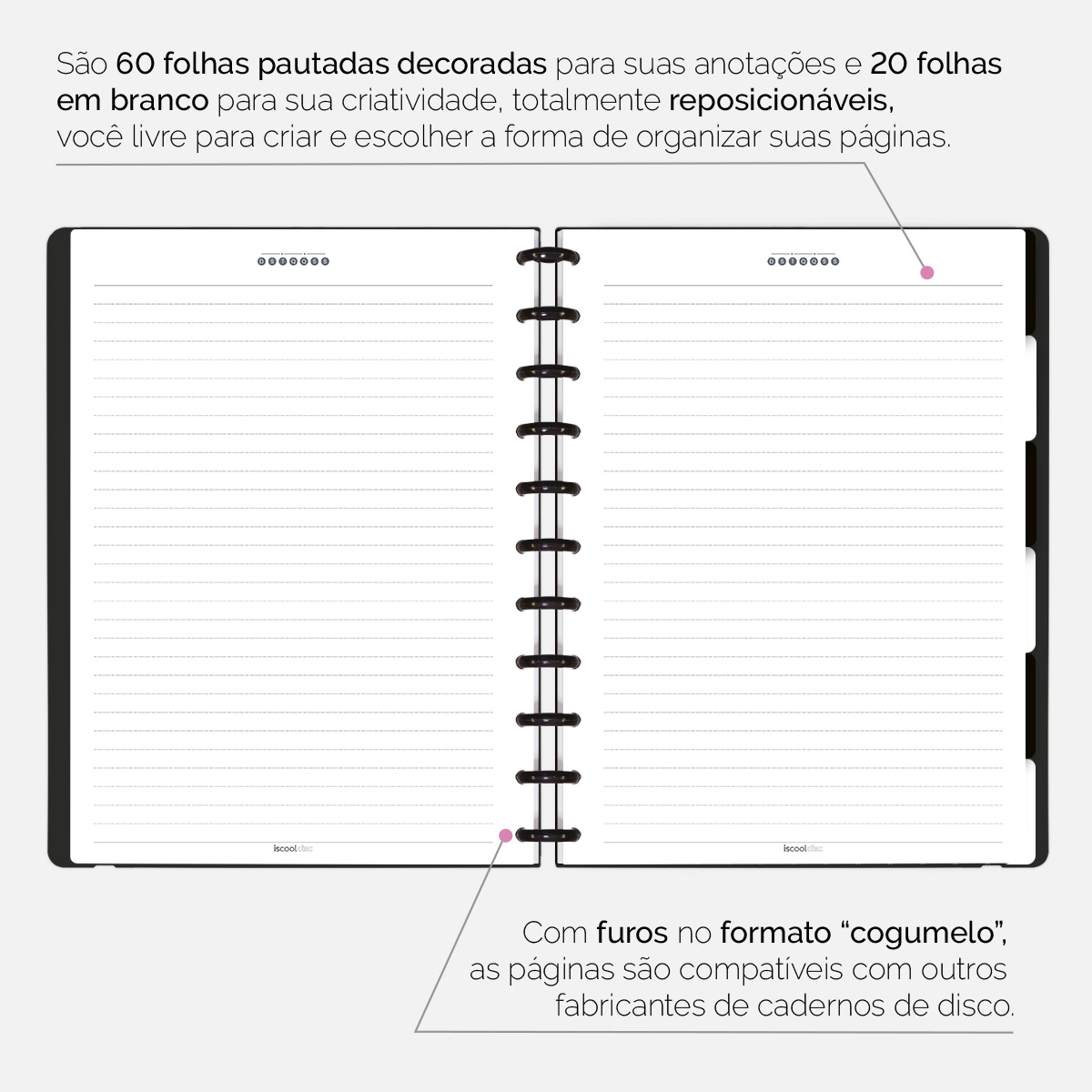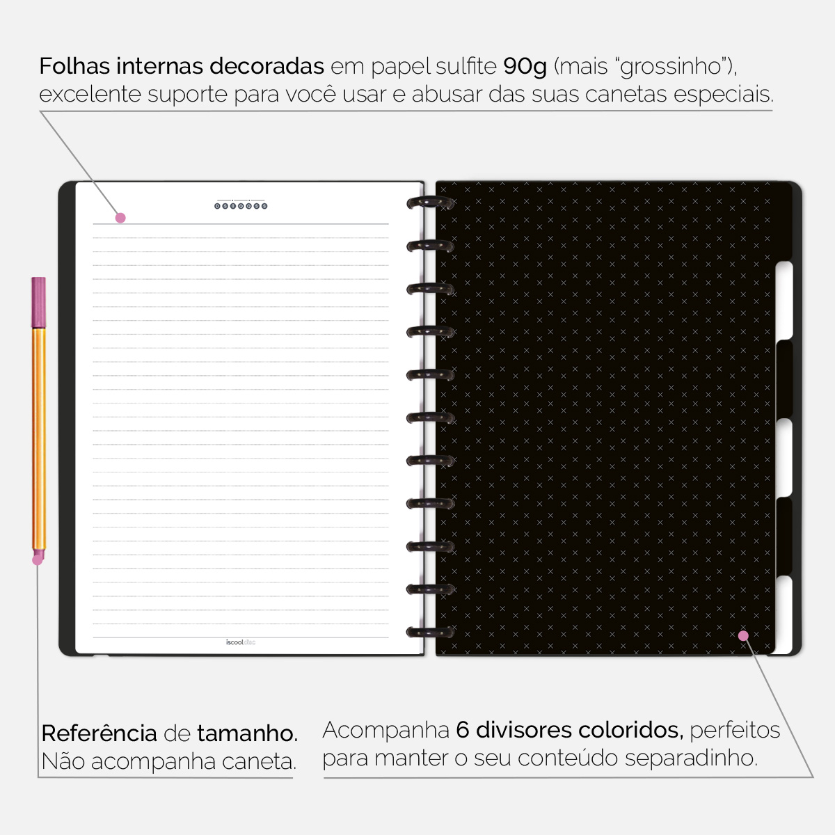 Além de tudo isso, o ISCOOL DISC FLEX, conta com detalhezinhos que fazem toda diferença: elástico removível para fechamento da capa, muito mais estilo e privacidade para suas anotações; bolsa plástica para guardar seus rascunhos, referências, lembretes, documentos e uma cartela de adesivos incríveis, para que você possa personalizar seu caderno do seu jeitinho!