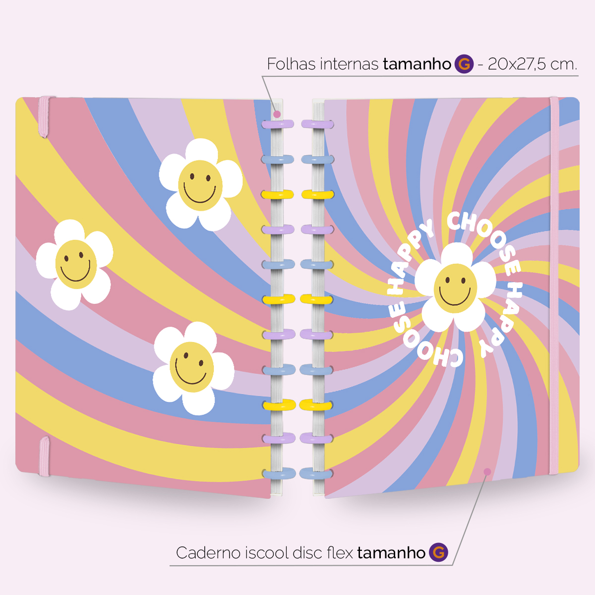 Além de tudo isso, o ISCOOL DISC FLEX, conta com detalhezinhos que fazem toda diferença: elástico removível para fechamento da capa, muito mais estilo e privacidade para suas anotações; bolsa plástica para guardar seus rascunhos, referências, lembretes, documentos e uma cartela de adesivos incríveis, para que você possa personalizar seu caderno do seu jeitinho!