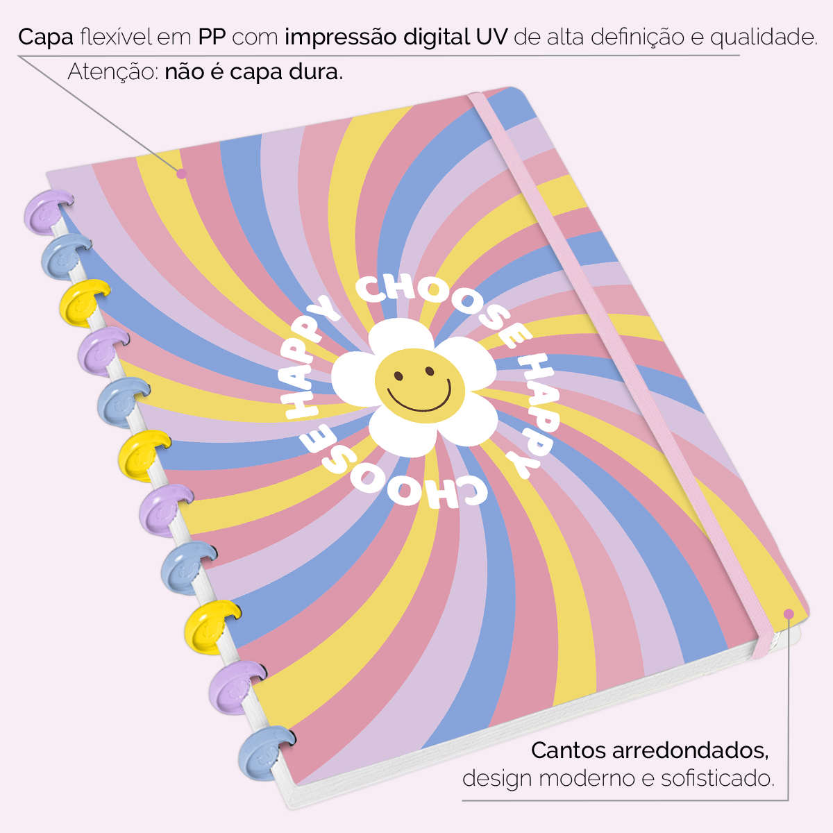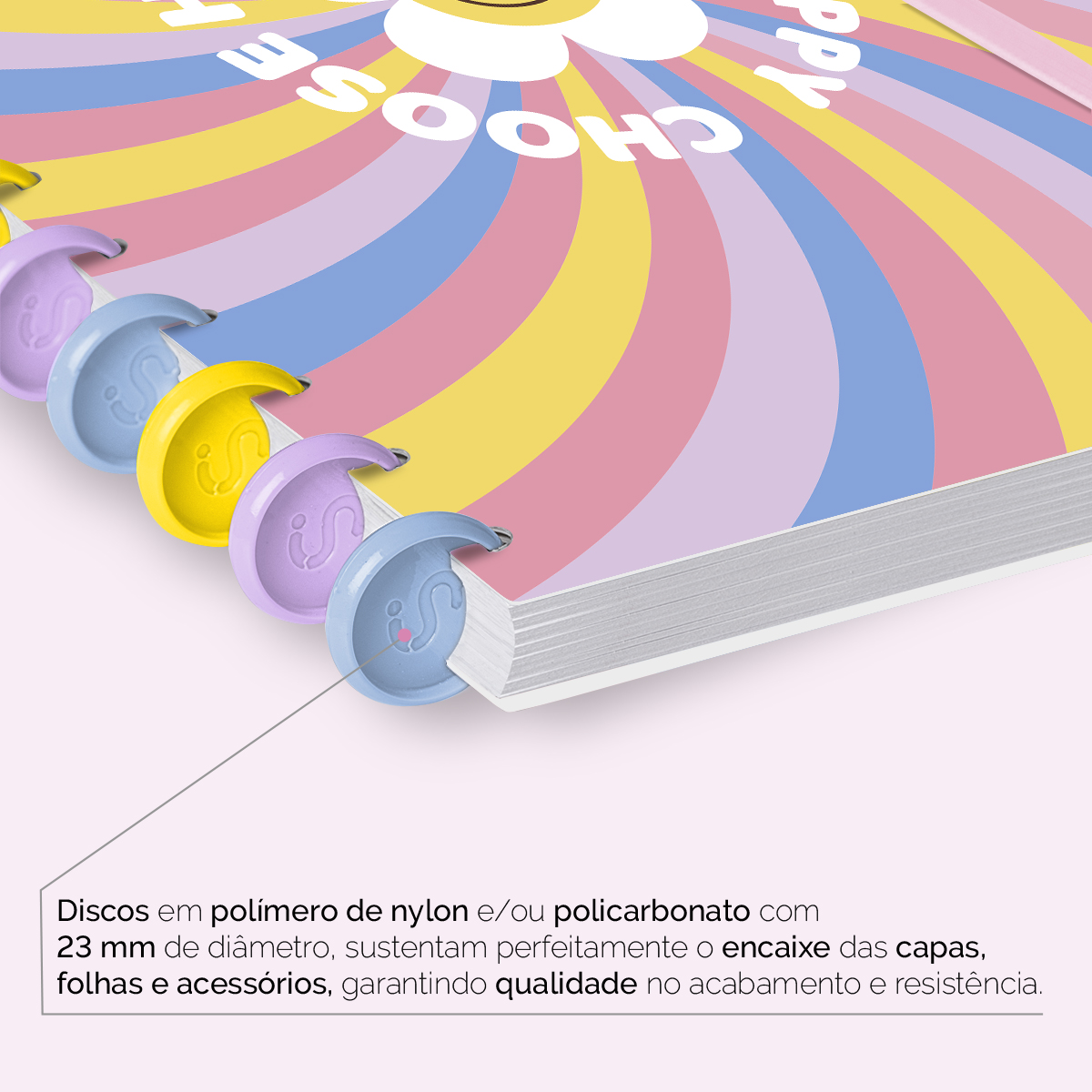 Encadernado com 11 discos M de 23mm em polímero de nylon e/ou policarbonato coloridos, fabricados no Brasil.