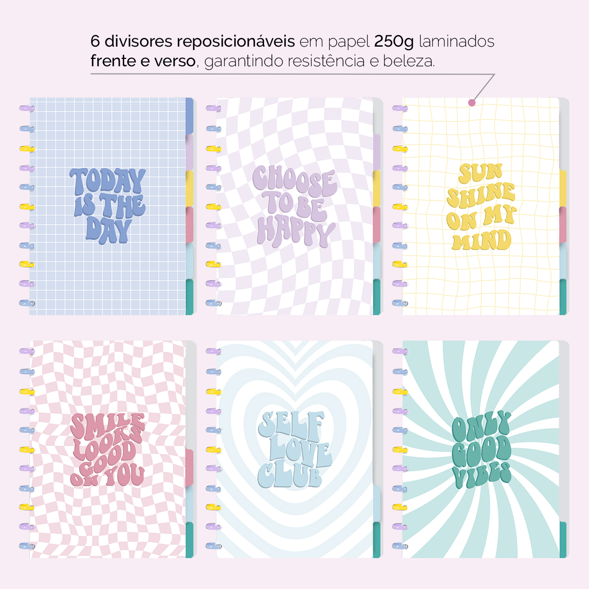 A capa é feita em PP com impressão digital UV de alta definição, acompanha 4 lindas divisórias, que você pode colocar em qualquer local do caderno, funcionando como o guia perfeito para sua organização.
