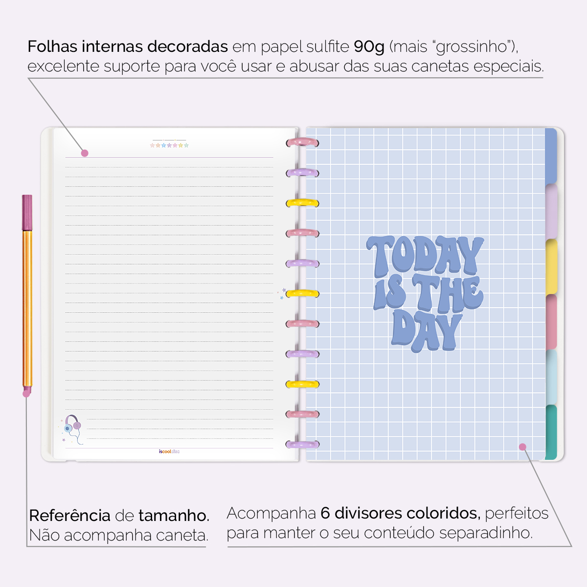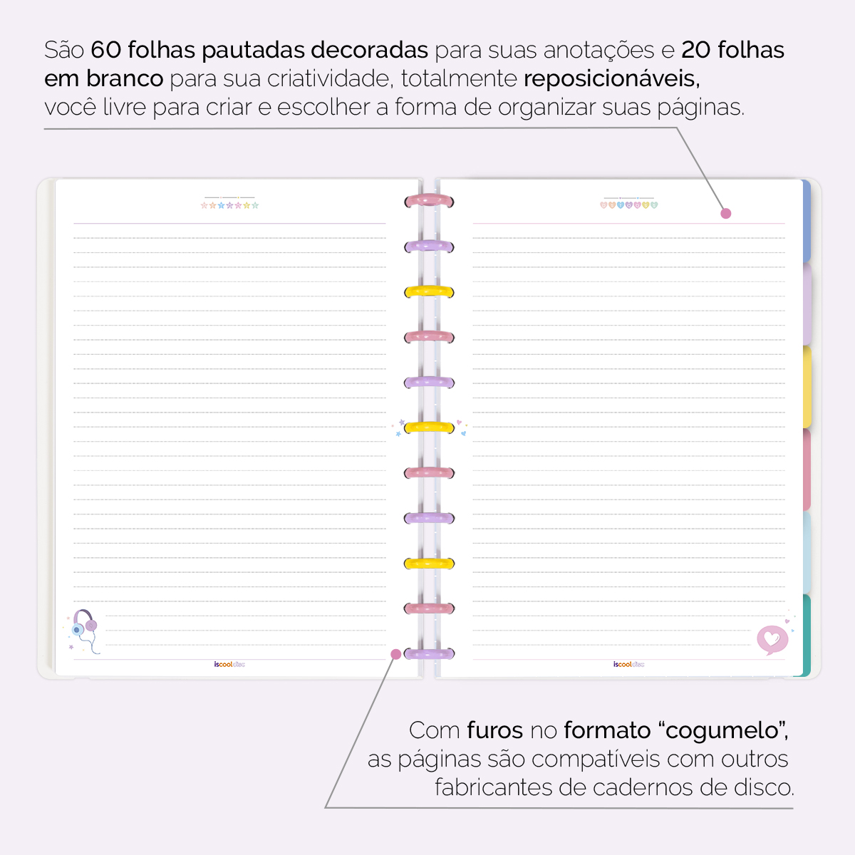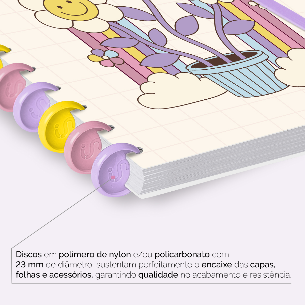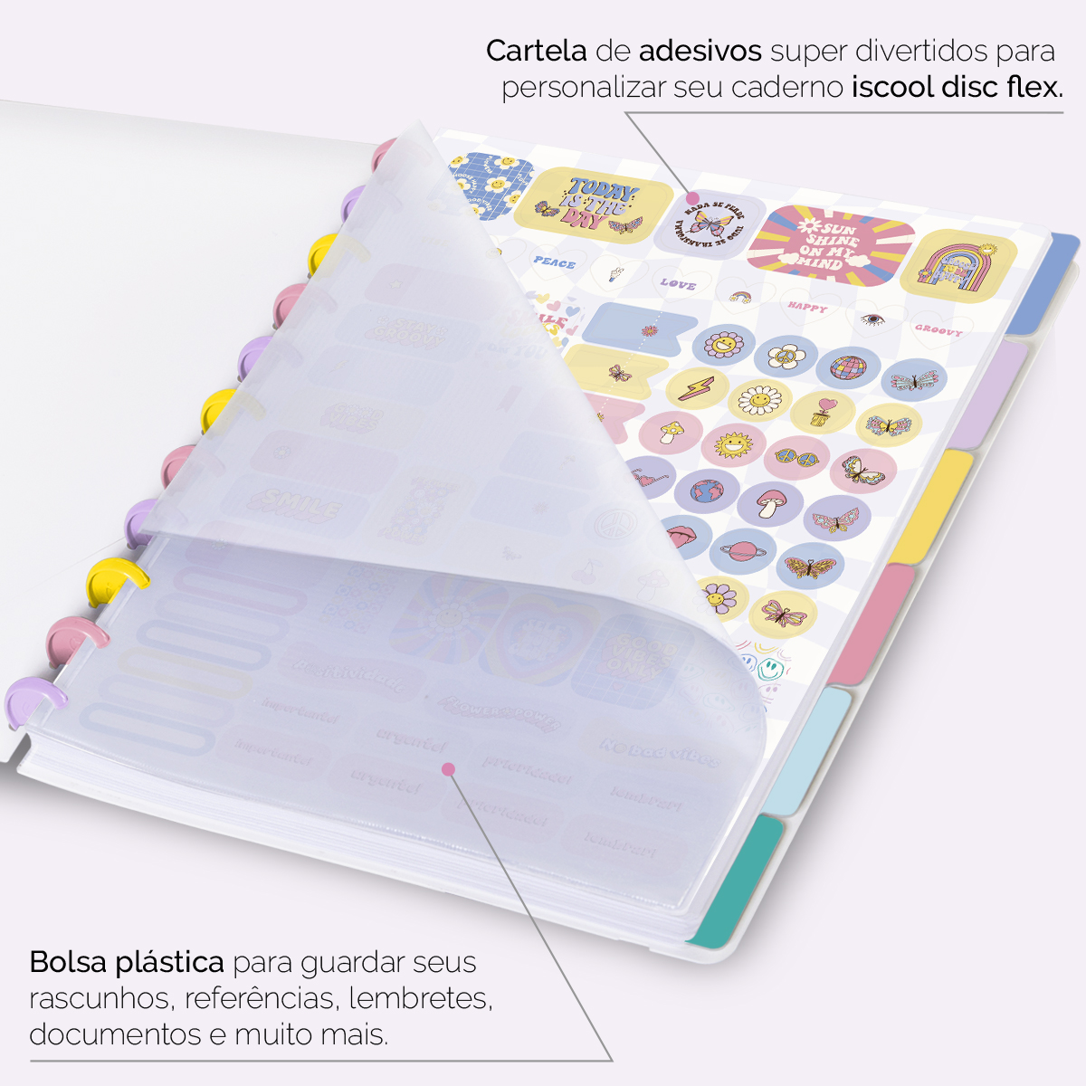 Além de tudo isso, o ISCOOL DISC FLEX, conta com detalhezinhos que fazem toda diferença: elástico removível para fechamento da capa, muito mais estilo e privacidade para suas anotações; bolsa plástica para guardar seus rascunhos, referências, lembretes, documentos e uma cartela de adesivos incríveis, para que você possa personalizar seu caderno do seu jeitinho!