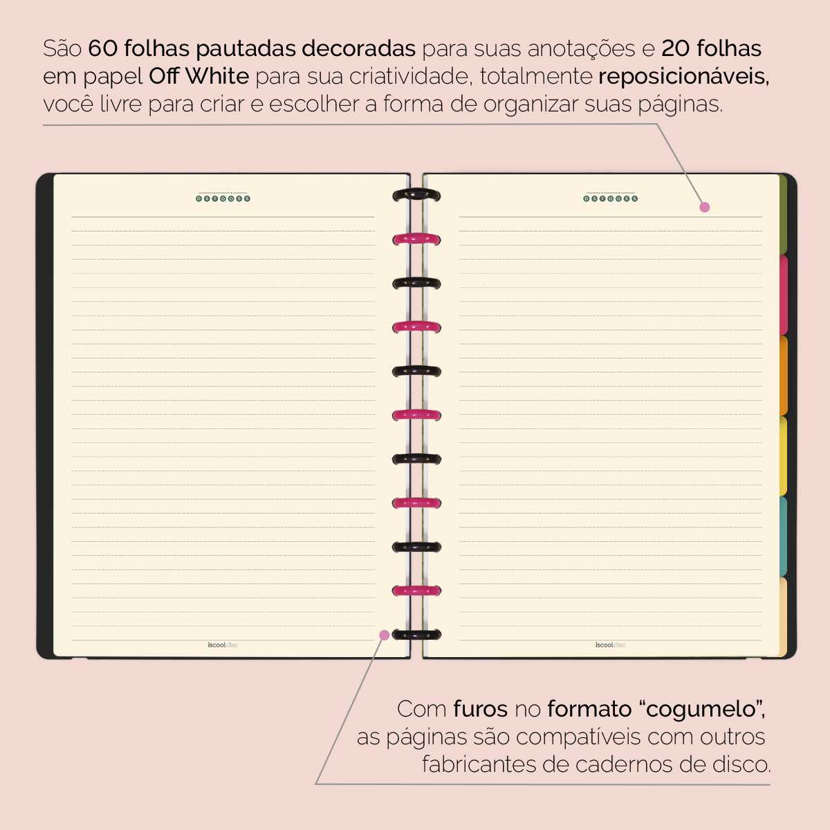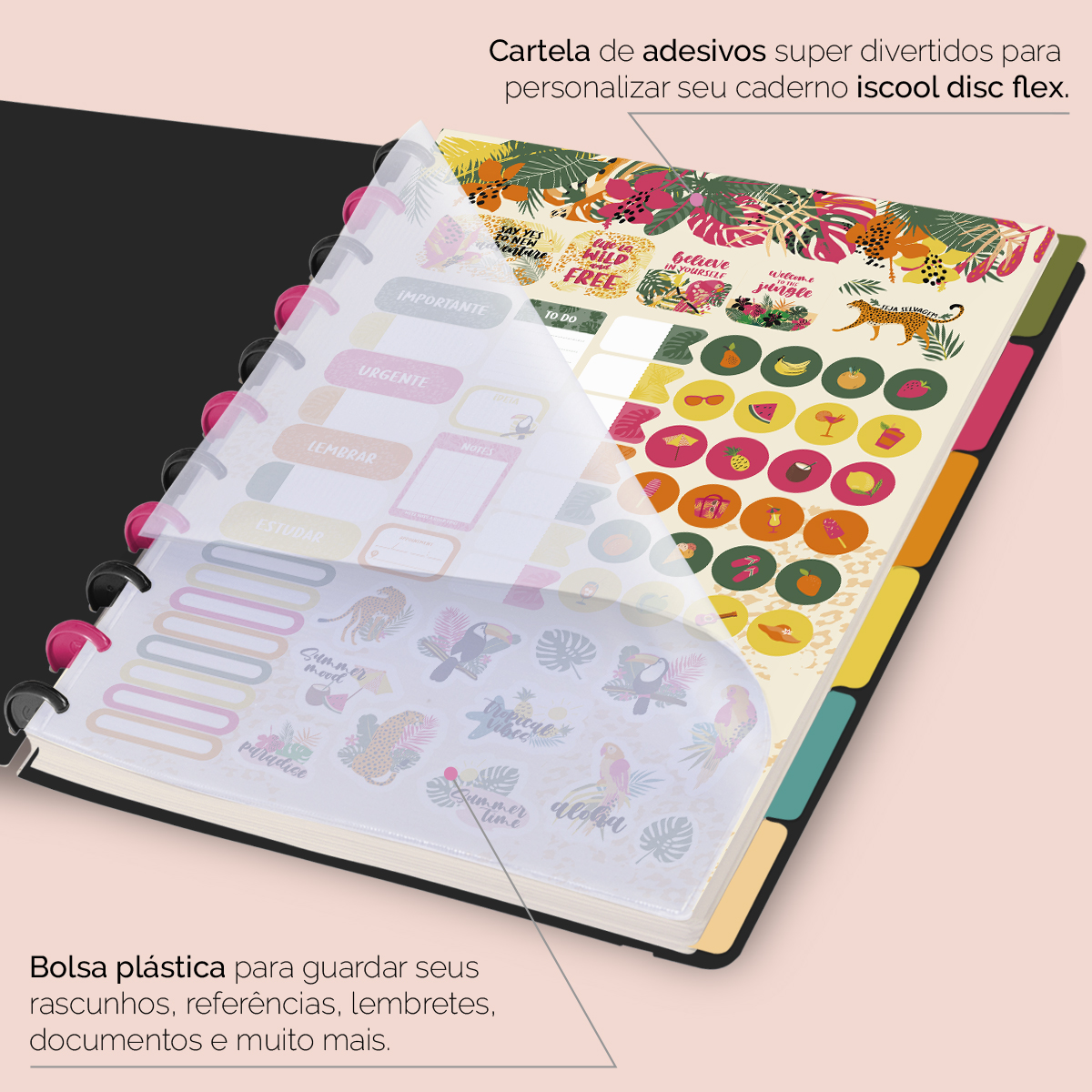 Além de tudo isso, o ISCOOL DISC FLEX, conta com detalhezinhos que fazem toda diferença: elástico removível para fechamento da capa, muito mais estilo e privacidade para suas anotações; bolsa plástica para guardar seus rascunhos, referências, lembretes, documentos e uma cartela de adesivos incríveis, para que você possa personalizar seu caderno do seu jeitinho!