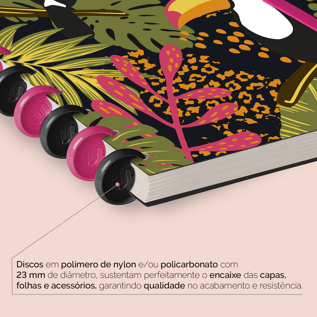 Os nossos discos são fabricados em polímero de nylon e/ou policarbonato, podem ser substituídos, proporcionando imensa variedade na combinação das cores, qualidade no acabamento e eficácia no encaixe das capas, folhas e acessórios.