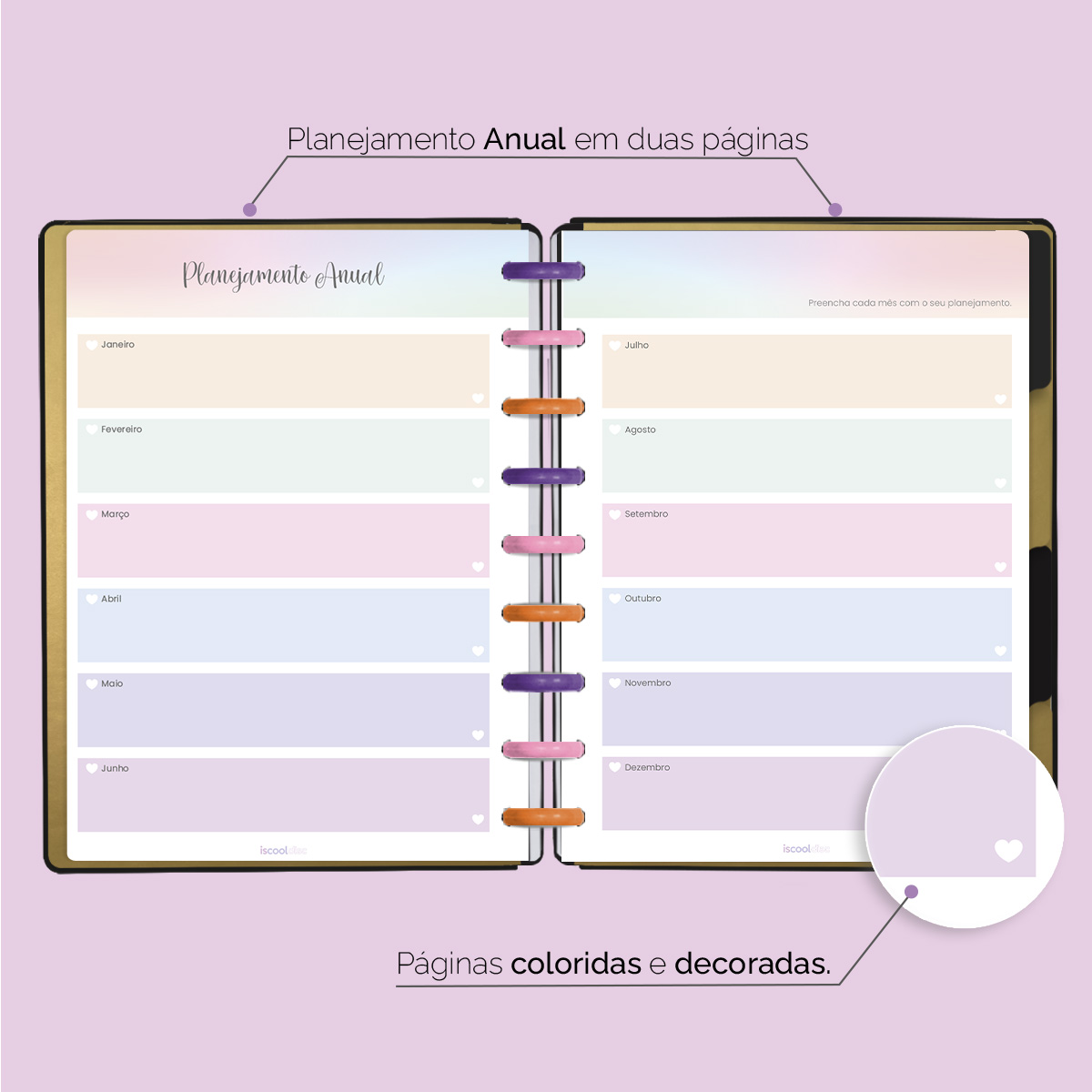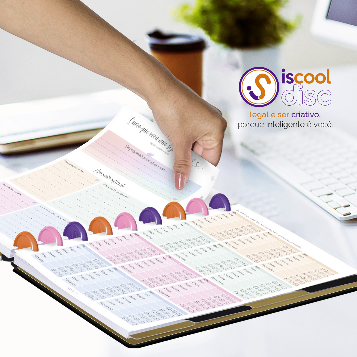 O ISCOOL DISC Planner Permanente foi criado especialmente para ajudar você a alcançar todas as suas metas e objetivos pessoais. É um planner totalmente customizável, no qual os elementos são reposicionáveis. Você pode montá-lo como preferir, deixando sua criatividade fluir livremente.