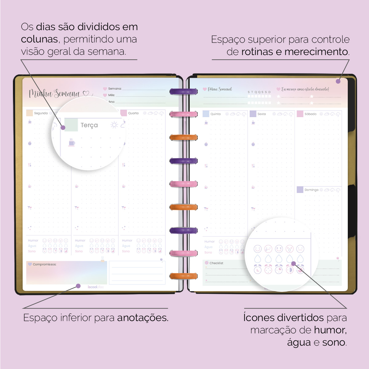 Os dias são divididos em colunas, permitindo uma visão geral da semana, onde você mesmo irá indicar o dia, a semana, o mês e o ano. Assim, você pode utilizar o seu planner independentemente do ano em que estivermos. Não é incrível?