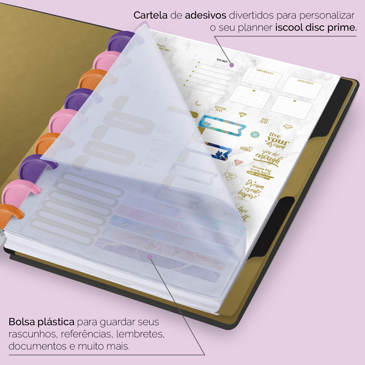 Além de tudo isso, o ISCOOL DISC Planner Permanente conta com detalhes que fazem toda a diferença: elástico para fechamento da capa, proporcionando muito mais estilo e privacidade para suas anotações; bolsa plástica para guardar seus rascunhos, referências, lembretes e documentos; e uma cartela de adesivos incríveis para que você possa personalizar o planner do seu jeitinho!