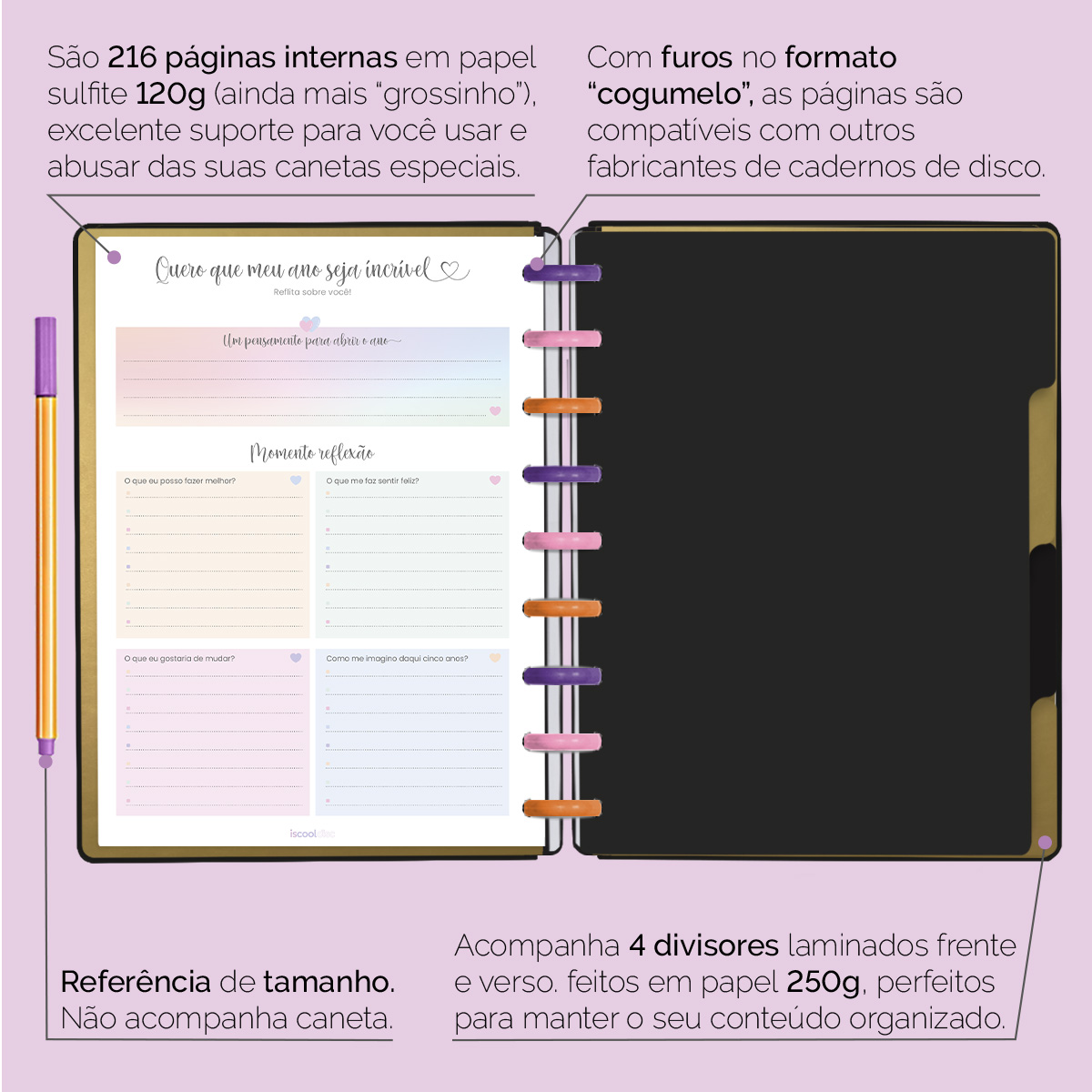 O miolo conta com páginas decoradas em papel sulfite 120g (aquele papel ainda mais "grossinho"), para que você use e abuse das suas canetas especiais. Com furos no formato de "cogumelo", você poderá dar um "up" nele com nossos refis, além de ser compatível com outros fabricantes de cadernos e planners de discos.
