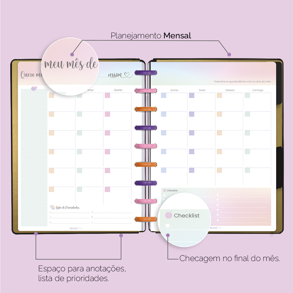 No início de cada mês, há um planejamento mensal, facilitando visualmente as suas principais anotações, um "Habit Tracker" para você desenvolver novos hábitos ou controlar os mais importantes, e ainda um planejamento financeiro, facilitando o controle das suas receitas e despesas, além de inúmeras outras funcionalidades.