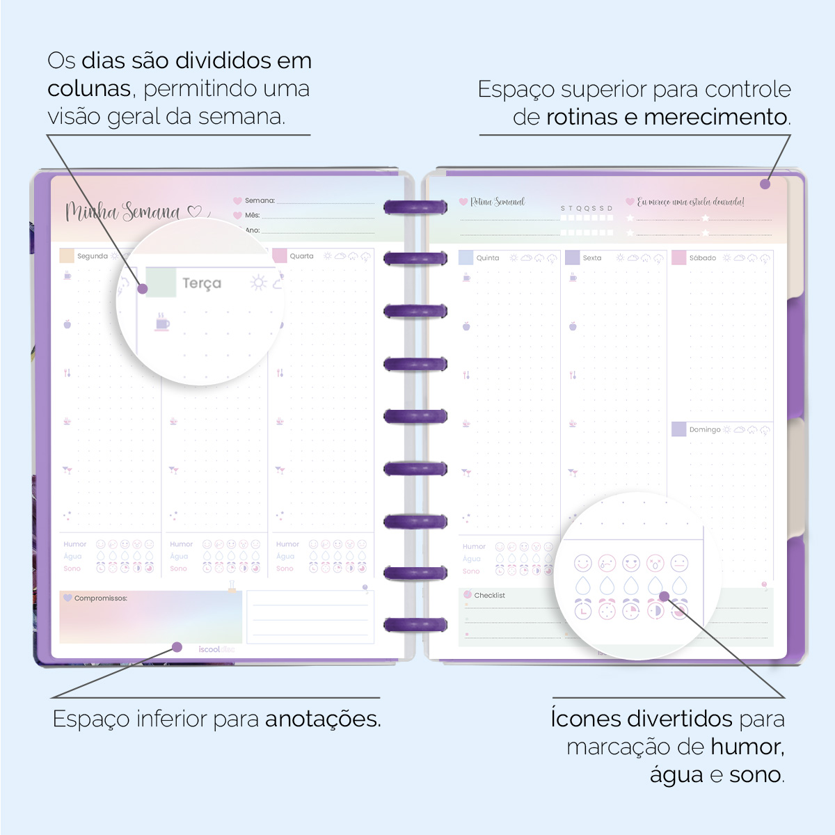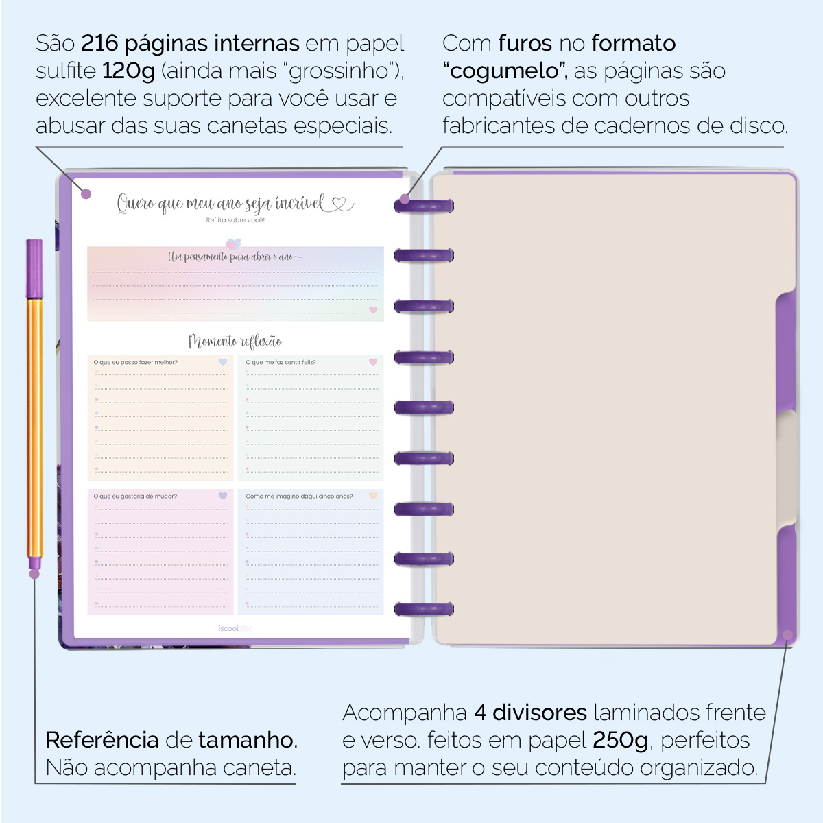 Além de tudo isso, o ISCOOL DISC Planner Permanente conta com detalhes que fazem toda a diferença: elástico para fechamento da capa, proporcionando muito mais estilo e privacidade para suas anotações; bolsa plástica para guardar seus rascunhos, referências, lembretes e documentos; e uma cartela de adesivos incríveis para que você possa personalizar o planner do seu jeitinho!