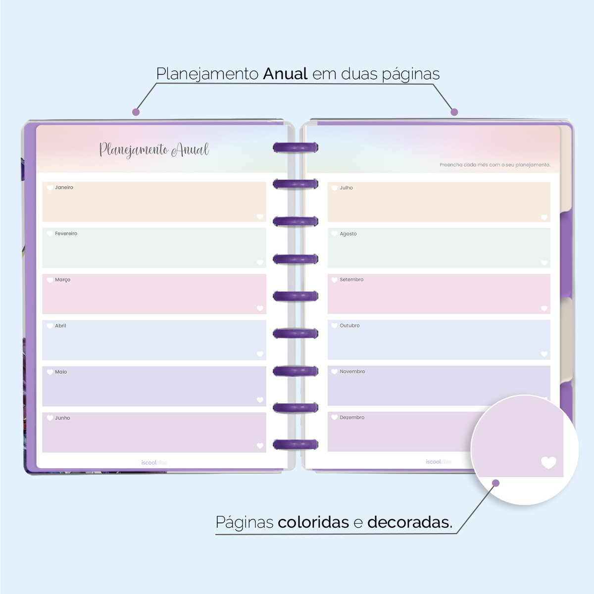 O ISCOOL DISC Planner Permanente foi criado especialmente para ajudar você a alcançar todas as suas metas e objetivos pessoais. É um planner totalmente customizável, no qual os elementos são reposicionáveis. Você pode montá-lo como preferir, deixando sua criatividade fluir livremente.
