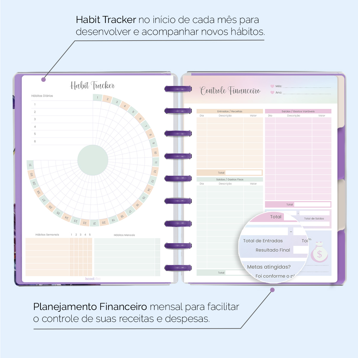 No início de cada mês, há um planejamento mensal, facilitando visualmente as suas principais anotações, um "Habit Tracker" para você desenvolver novos hábitos ou controlar os mais importantes, e ainda um planejamento financeiro, facilitando o controle das suas receitas e despesas, além de inúmeras outras funcionalidades.