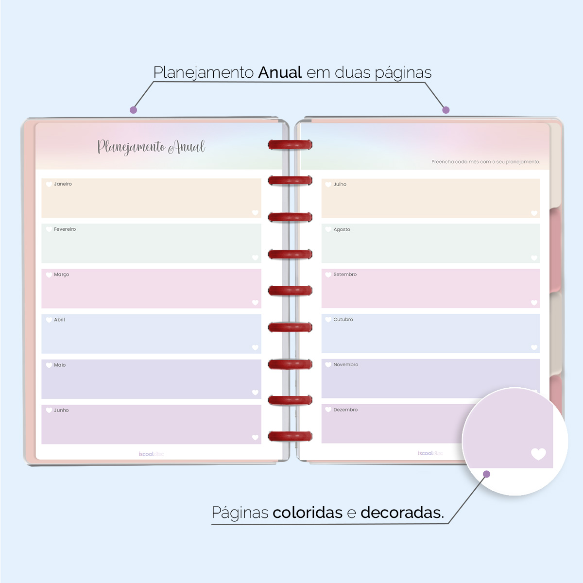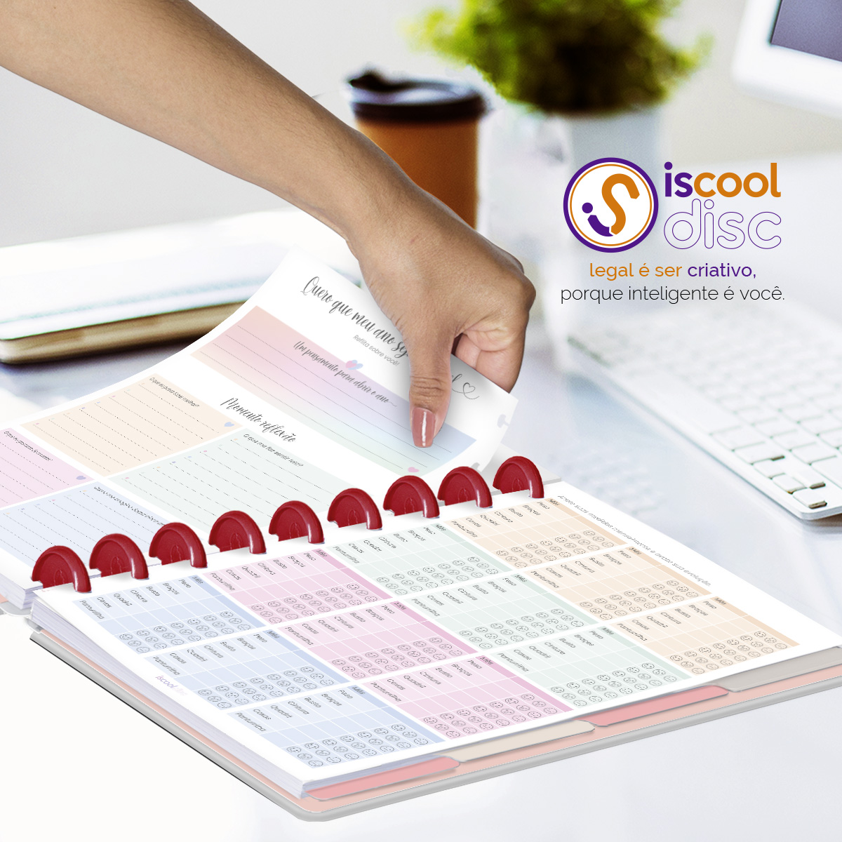 O ISCOOL DISC Planner Permanente foi criado especialmente para ajudar você a alcançar todas as suas metas e objetivos pessoais. É um planner totalmente customizável, no qual os elementos são reposicionáveis. Você pode montá-lo como preferir, deixando sua criatividade fluir livremente.