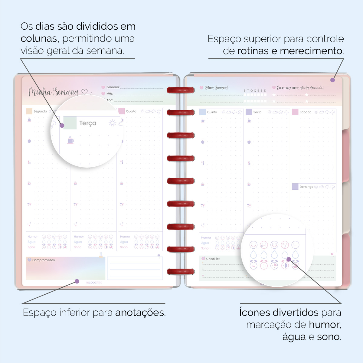 Os dias são divididos em colunas, permitindo uma visão geral da semana, onde você mesmo irá indicar o dia, a semana, o mês e o ano. Assim, você pode utilizar o seu planner independentemente do ano em que estivermos. Não é incrível?