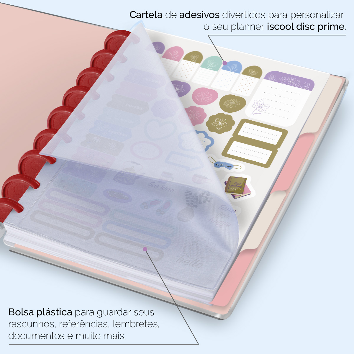Além de tudo isso, o ISCOOL DISC Planner Permanente conta com detalhes que fazem toda a diferença: elástico para fechamento da capa, proporcionando muito mais estilo e privacidade para suas anotações; bolsa plástica para guardar seus rascunhos, referências, lembretes e documentos; e uma cartela de adesivos incríveis para que você possa personalizar o planner do seu jeitinho!