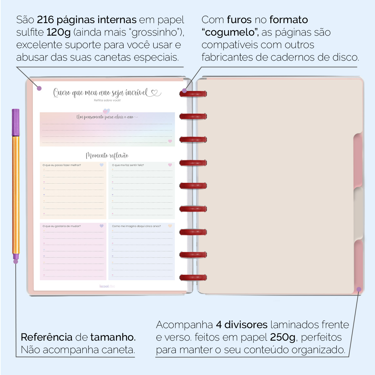 O miolo conta com páginas decoradas em papel sulfite 120g (aquele papel ainda mais "grossinho"), para que você use e abuse das suas canetas especiais. Com furos no formato de "cogumelo", você poderá dar um "up" nele com nossos refis, além de ser compatível com outros fabricantes de cadernos e planners de discos.