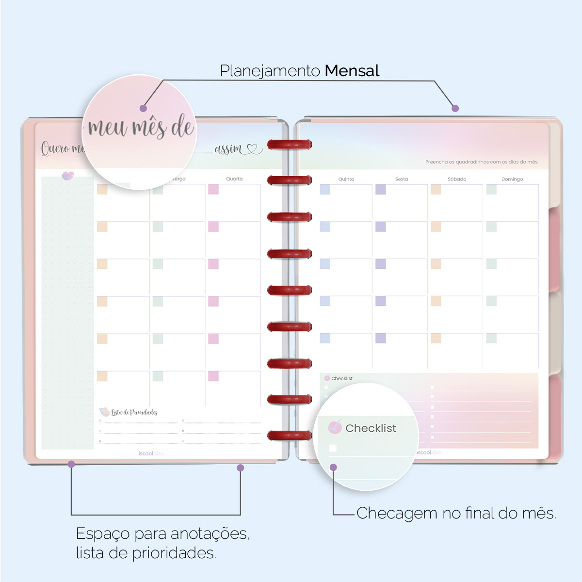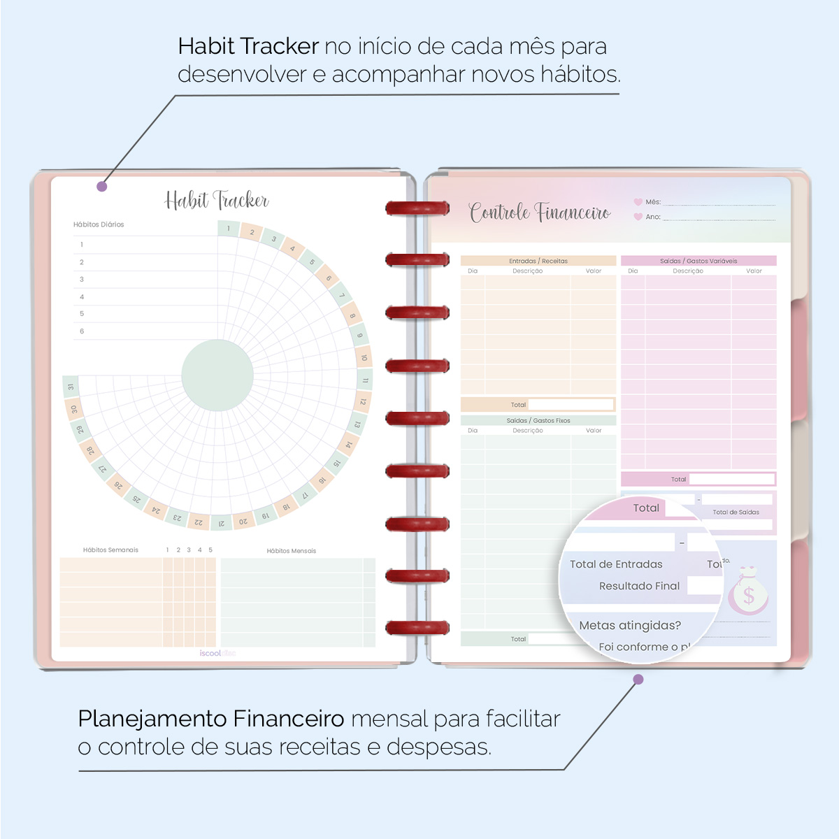 No início de cada mês, há um planejamento mensal, facilitando visualmente as suas principais anotações, um "Habit Tracker" para você desenvolver novos hábitos ou controlar os mais importantes, e ainda um planejamento financeiro, facilitando o controle das suas receitas e despesas, além de inúmeras outras funcionalidades.