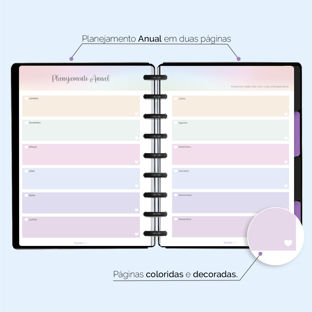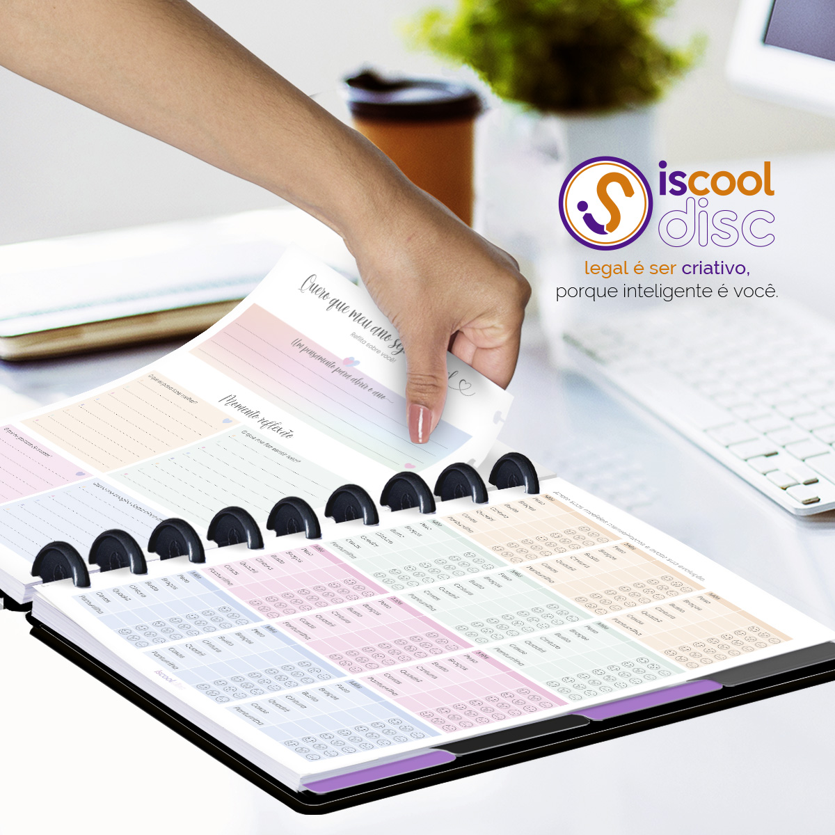 O ISCOOL DISC Planner Permanente foi criado especialmente para ajudar você a alcançar todas as suas metas e objetivos pessoais. É um planner totalmente customizável, no qual os elementos são reposicionáveis. Você pode montá-lo como preferir, deixando sua criatividade fluir livremente.