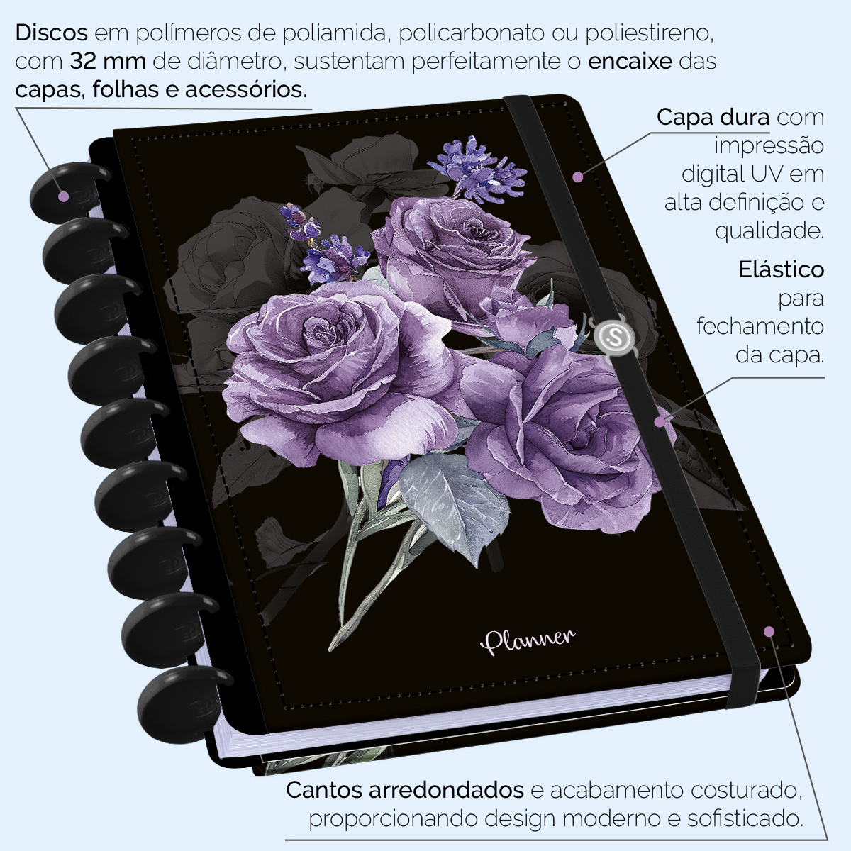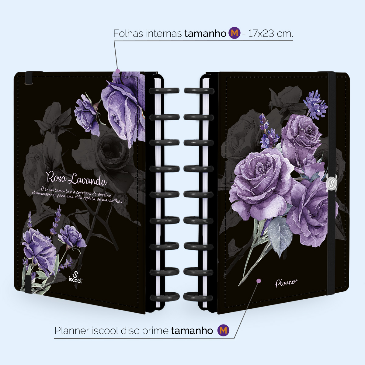 Iscool Disc Planner Permanente Floriografia Rosas Lavanda Preto