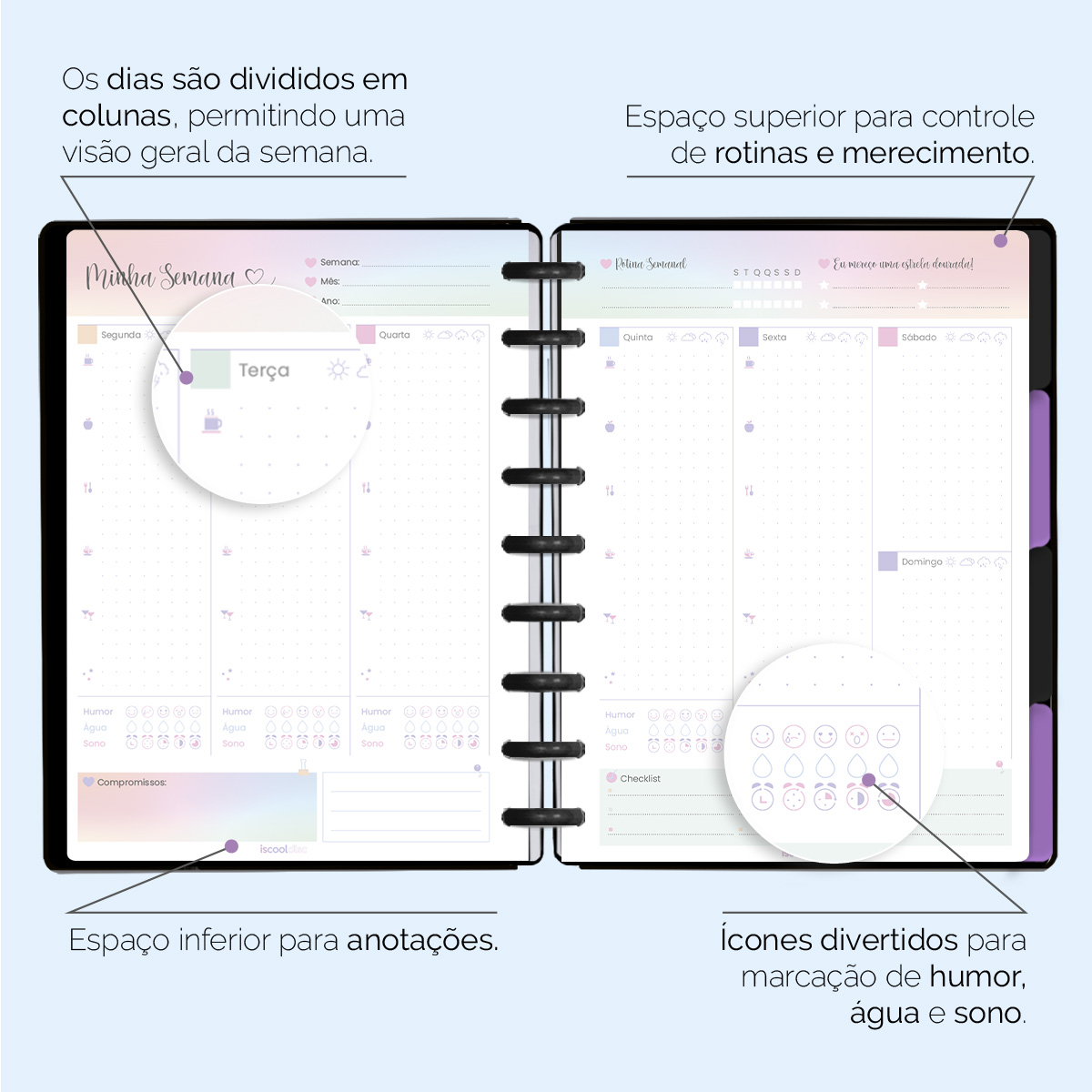 Os dias são divididos em colunas, permitindo uma visão geral da semana, onde você mesmo irá indicar o dia, a semana, o mês e o ano. Assim, você pode utilizar o seu planner independentemente do ano em que estivermos. Não é incrível?